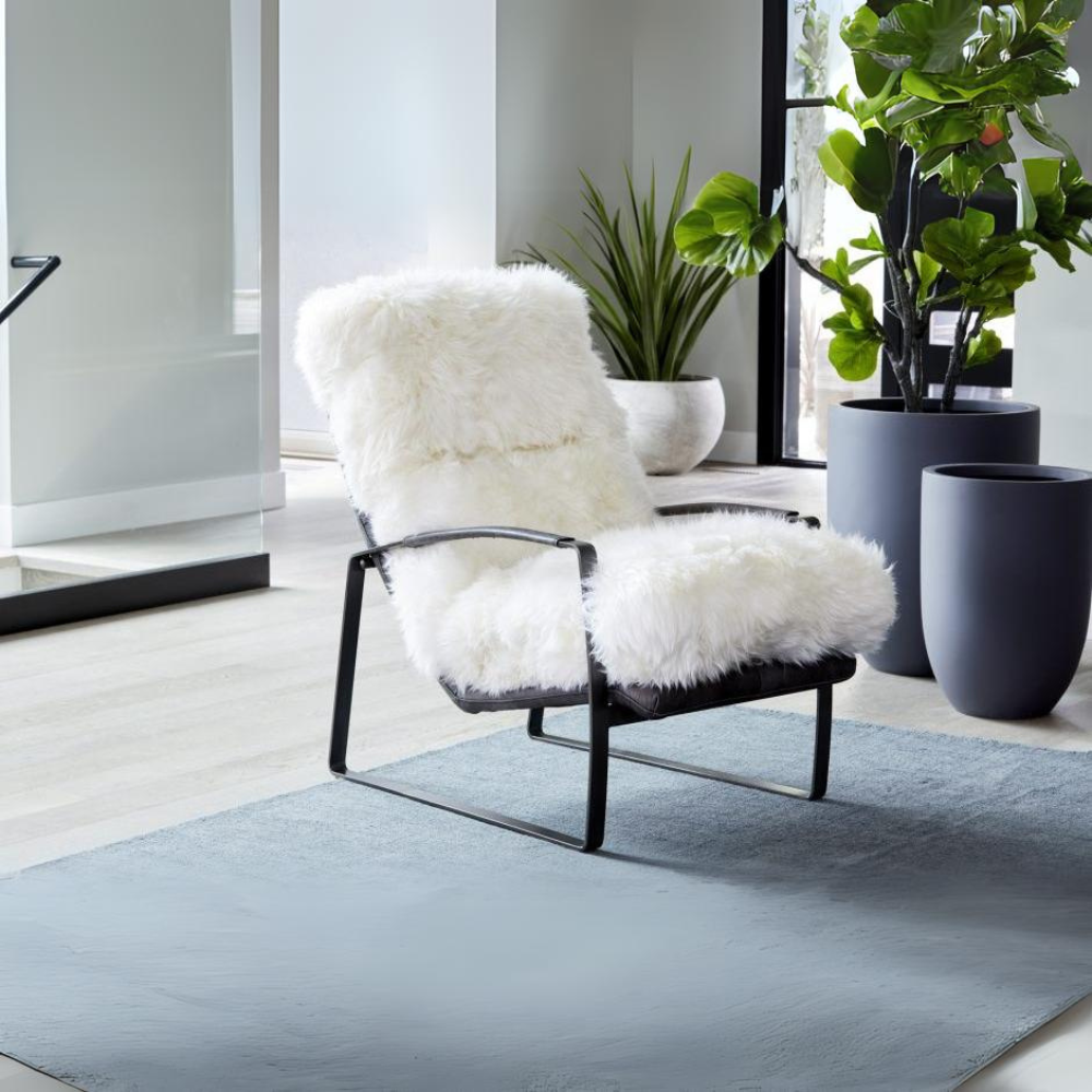 Fall in love with our cozy Hanly accent chair. Natural, long hair sheepskin makes sitting in this chair feel like a dream. An iron base and top-grain leather make this a stellar addition to your home.