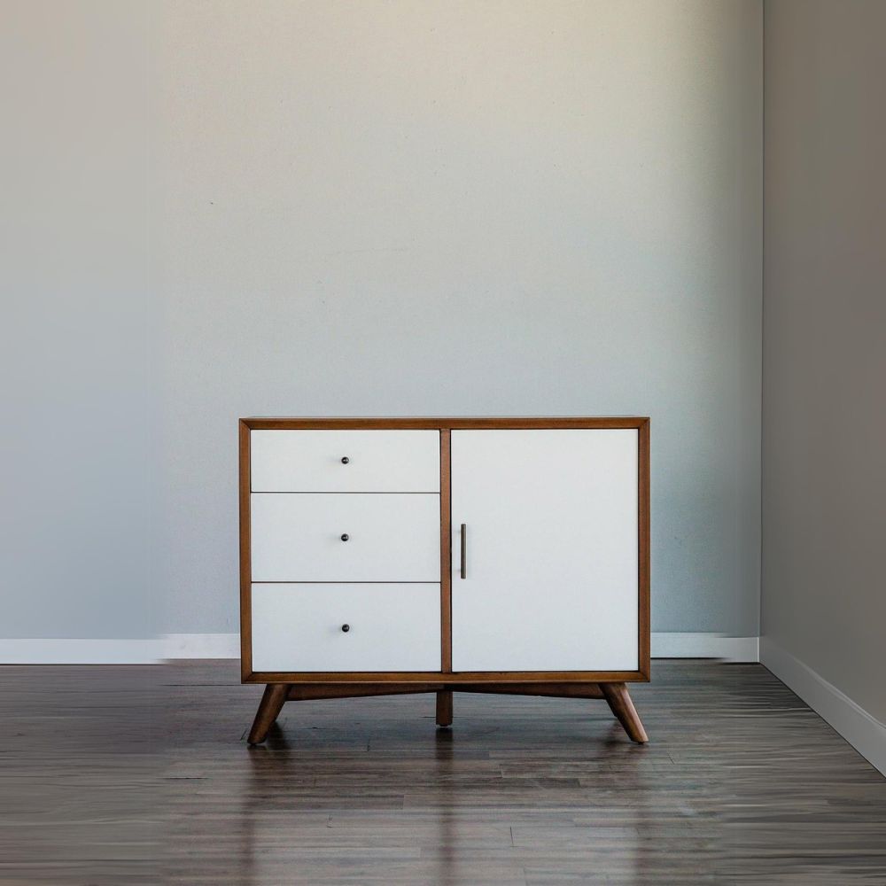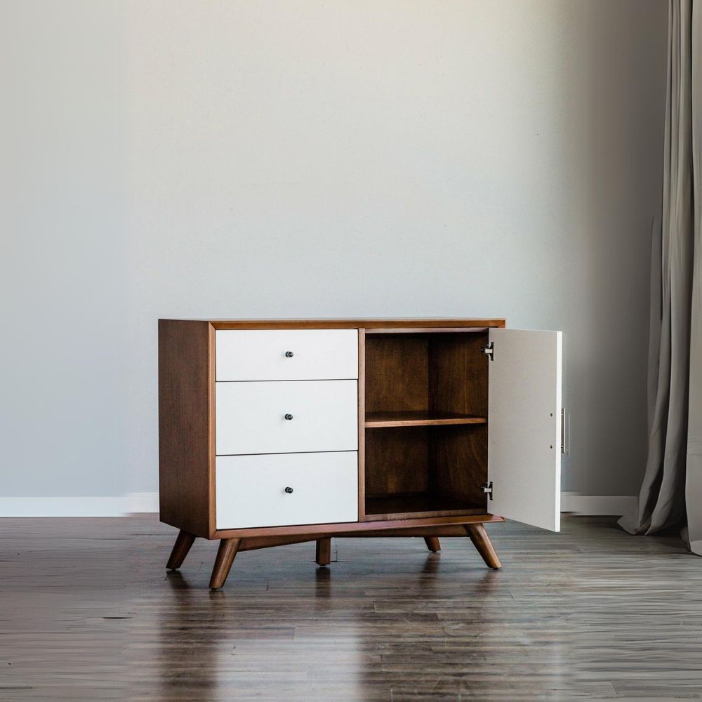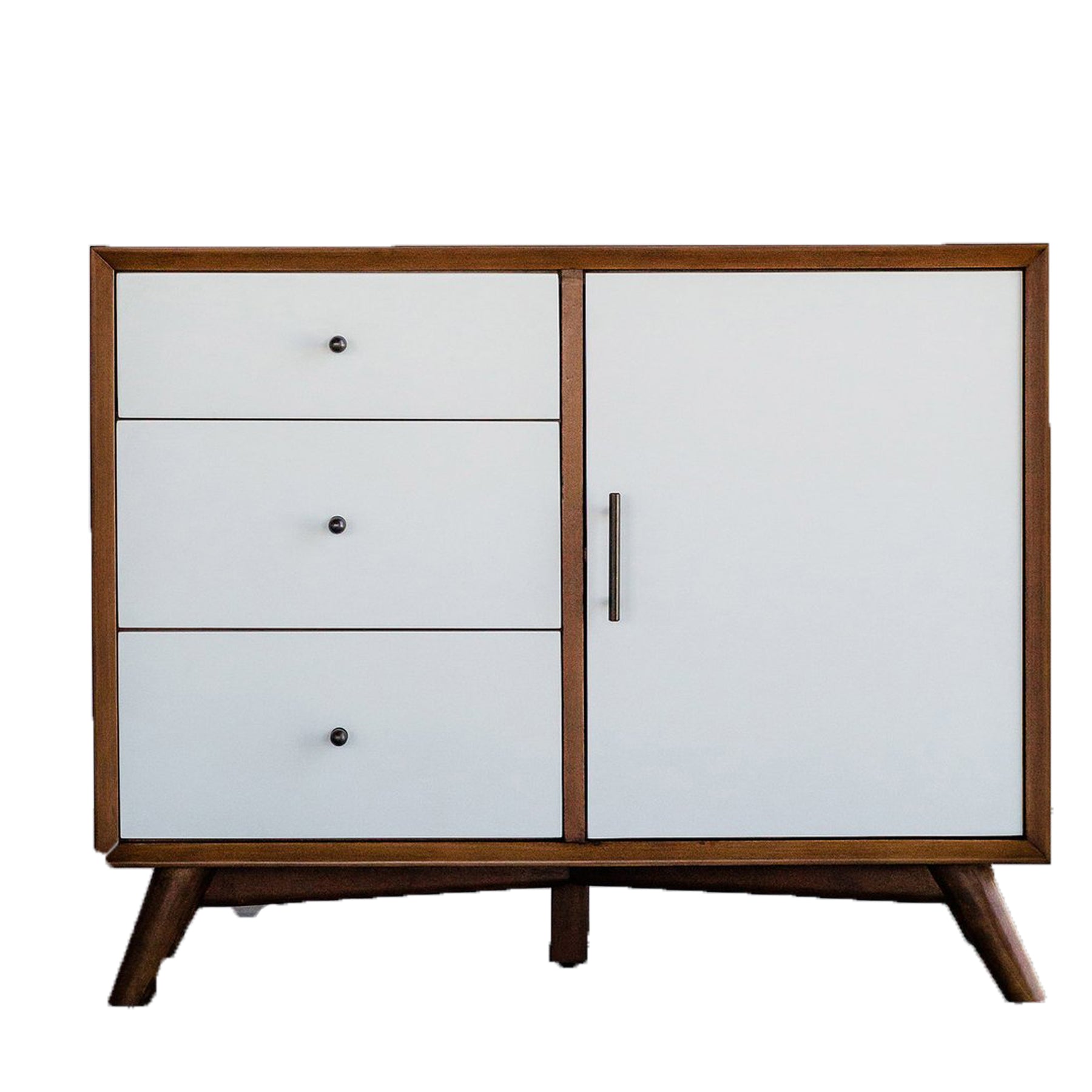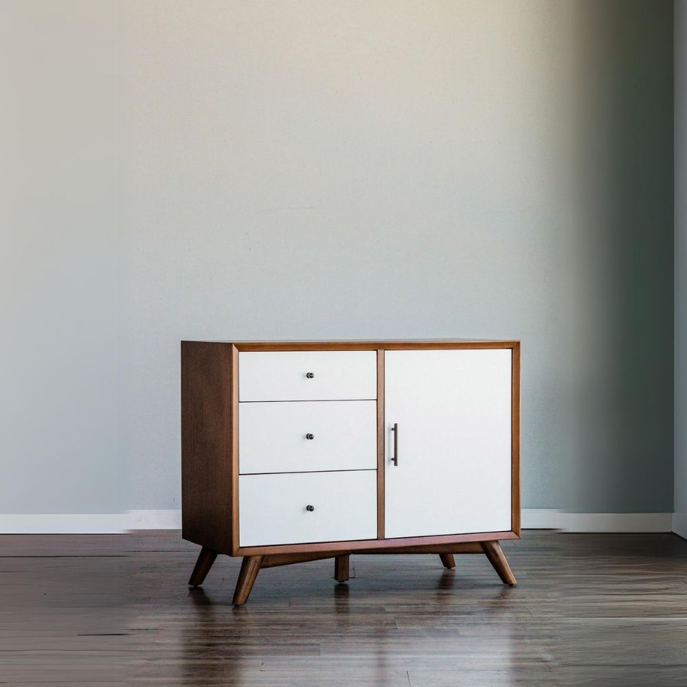 The Flynn collection features the classic lines of Mid-Century Modern furniture that never goes out of style. Its sturdy frames are built to last, constructed of sustainably sourced solid Mahogany wood and Okoume Veneer to ensure a lifetime of use. The accent cabinet provides a roomy storage solution featuring 3 drawers and a cabinet with a rolling door to hold your valuables or electronic devices. Drawers are made with English Dovetail construction and ball-bearing metal drawer glides. The top drawer is felt-lined. The Flynn collection makes it easy to create a cohesive decorating style or mix and match for a more personalized look. Available in a beautiful Acorn (Brown)/White, Acorn (Brown), or all-White finish.