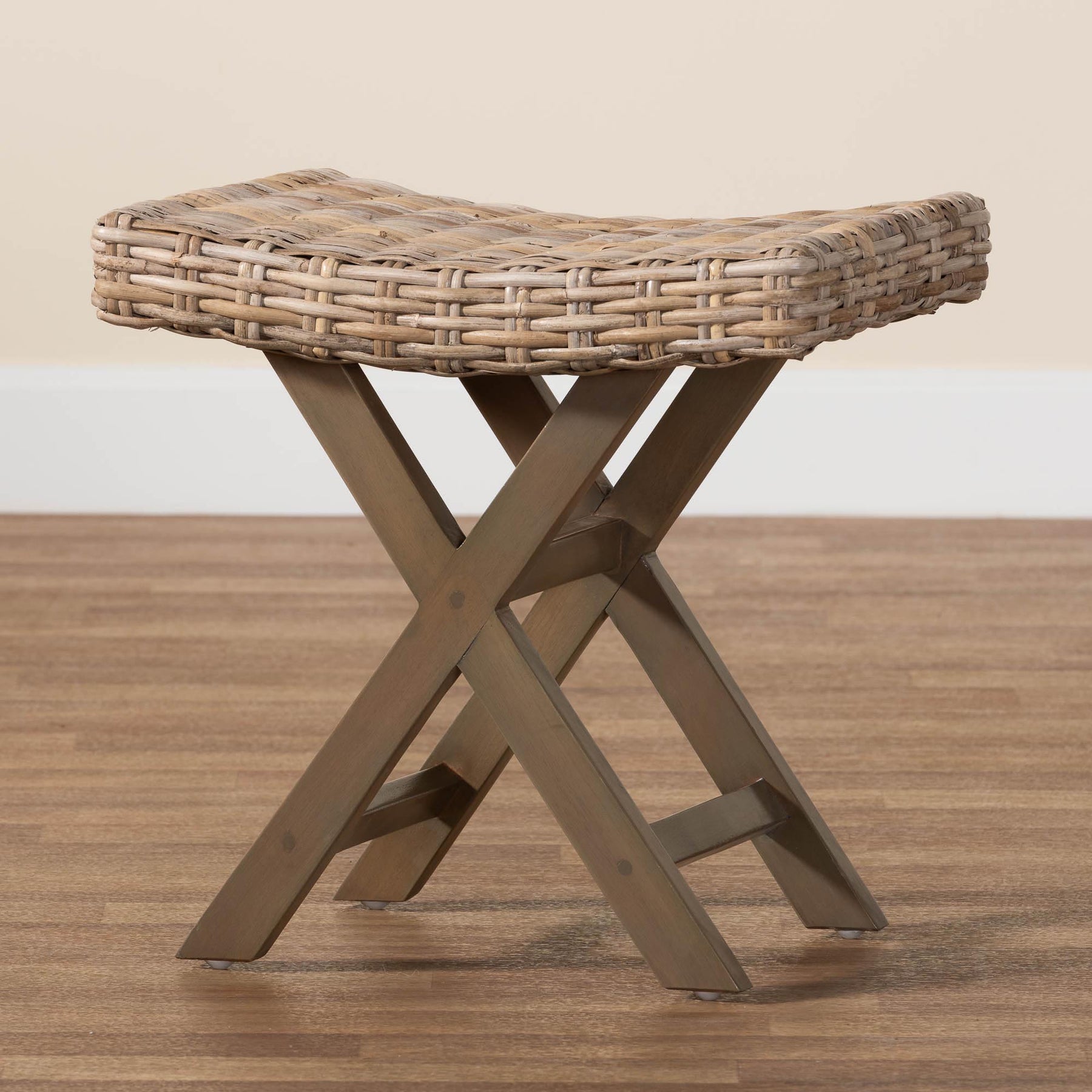 Hayate Bohemian Grey Kubu Rattan And Mahogany Wood Ottoman Footstool