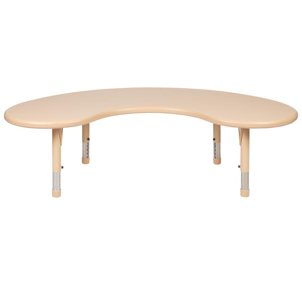 Upgrade your educational furniture with this multi-purpose table for learning, crafting and snack time. Perfect as a classroom table, the safety rounded corners reduce injury around rambunctious toddlers. The neutral tone focuses children on learning assignments. Adjustable height legs give you the flexibility to raise or lower to accommodate kids up to the age of 7. Children appreciate having their own area within the common areas of the home to perform a variety of tasks. Host parties and play dates while accommodating 8 children around this moon shaped plastic table. Don't let spills ruin the fun, the low maintenance top is easy to clean. Moon shaped classroom tables allow the teacher to be the focus on one side during small group sessions. This plastic table is heavy-duty for use in preschools, daycares and playrooms. Pair with our natural plastic stackable school chairs for a complete table and chair ensemble.