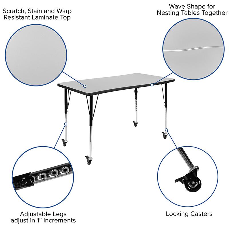 Mobile 28"W x 47.5"L Rectangular Wave Collaborative Grey Thermal Laminate Activity Table-Standard Height Adjustable Legs