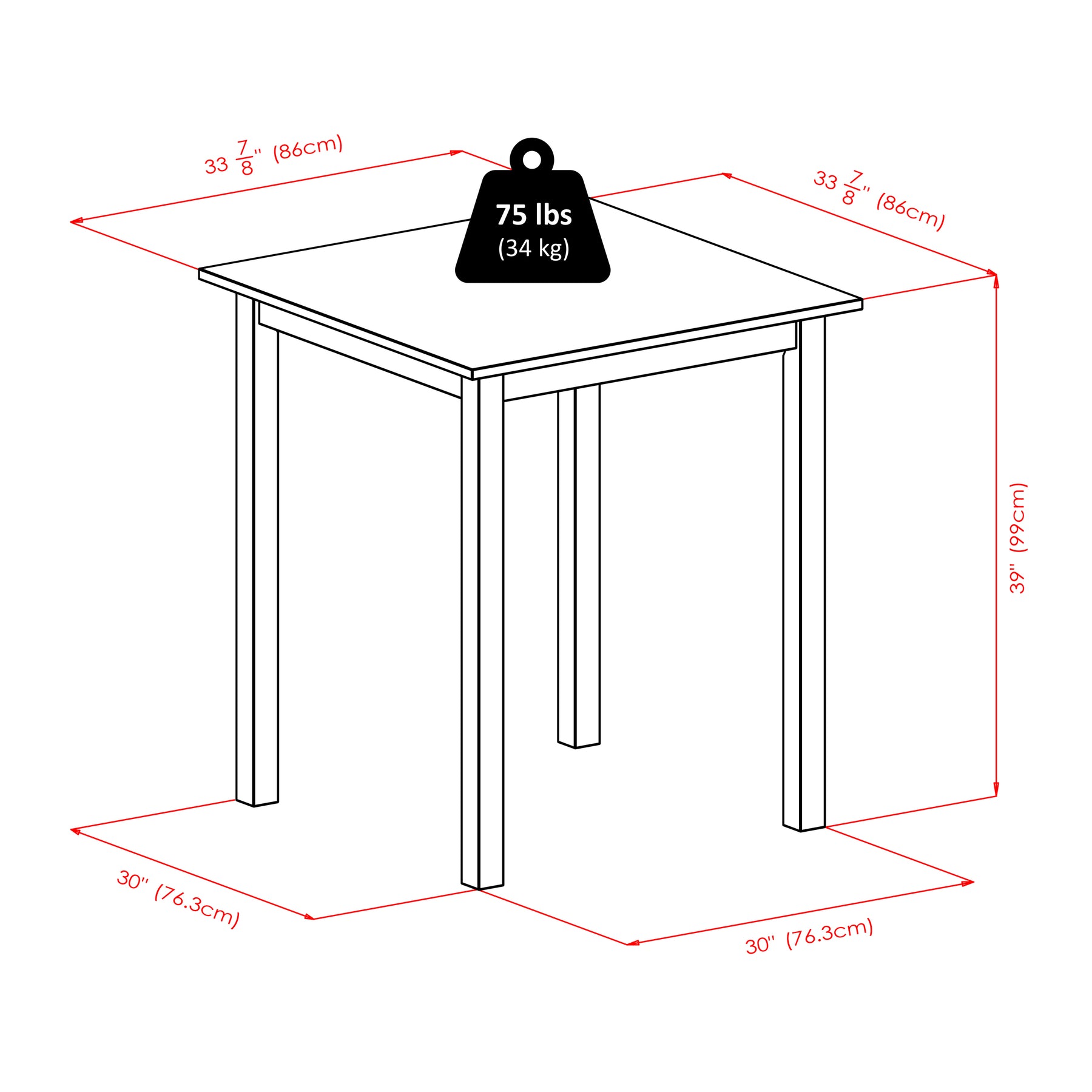 - Square Table assembled size is 33.86"W x 33.86"D x 38.98"H.