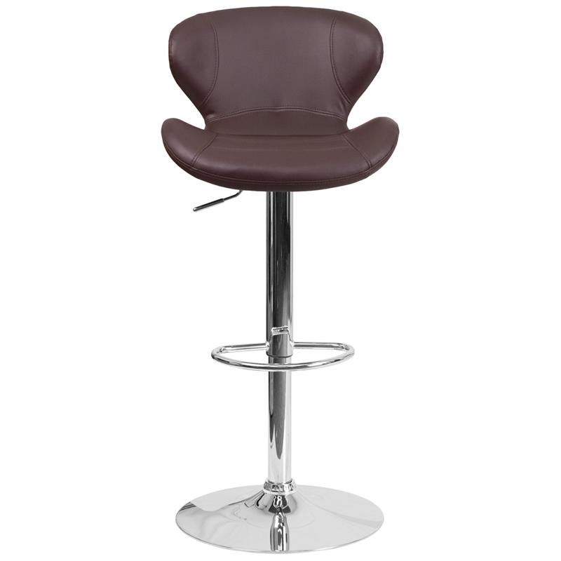 Contemporary Brown Vinyl Adjustable Height Barstool with Curved Back and Chrome Base