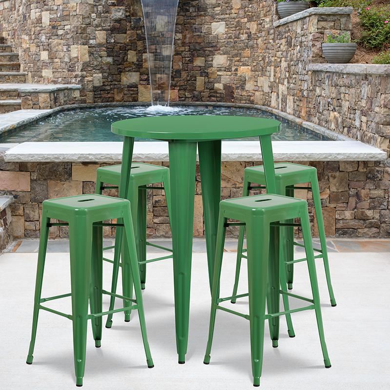 30'' Round Green Metal In-Outdoor Bar Table Set - 4 Square Seat Backless Stools