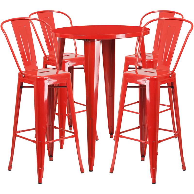 30'' Round Red Metal Indoor-Outdoor Bar Table Set with 4 Cafe Stools