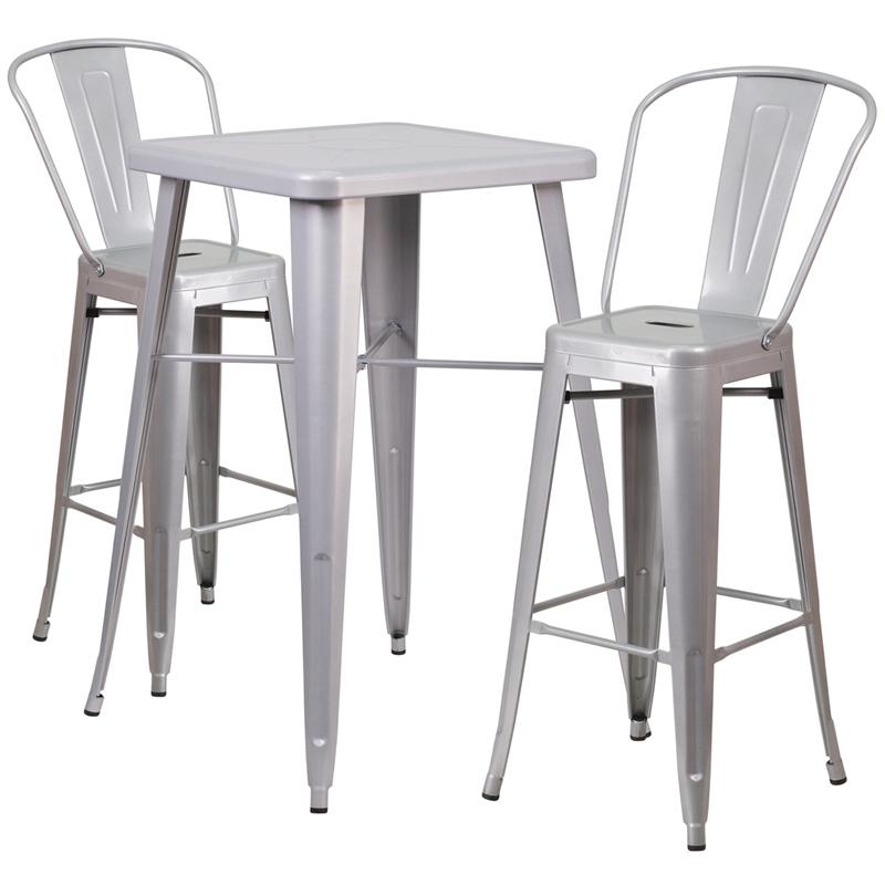 Commercial Grade 23.75" Square Silver Metal Indoor-Outdoor Bar Table Set with 2 Stools with Backs