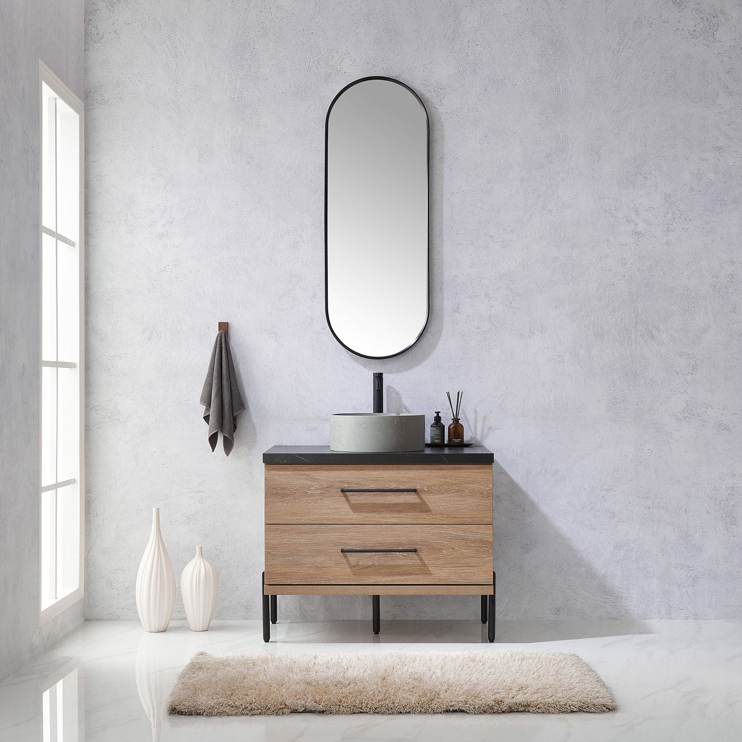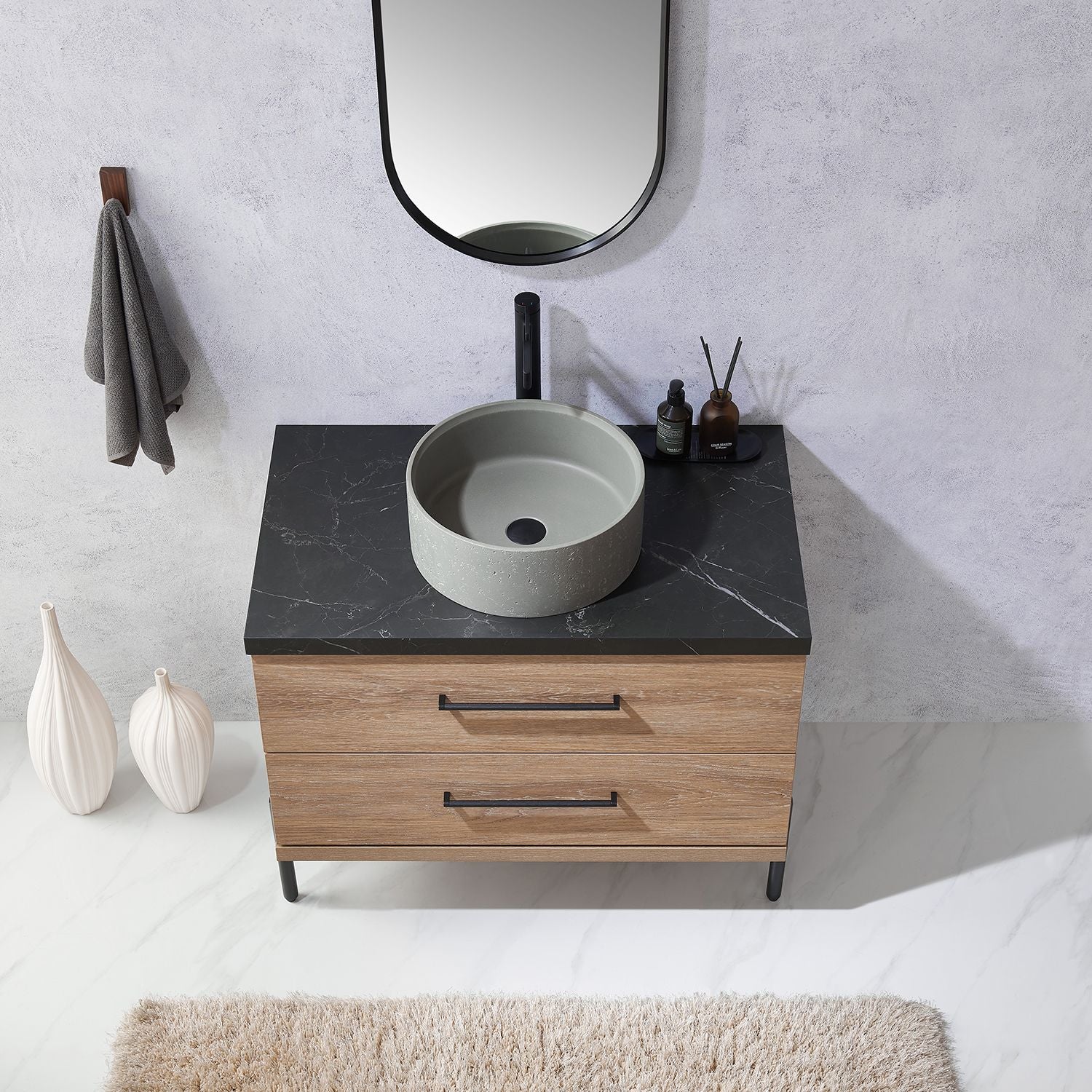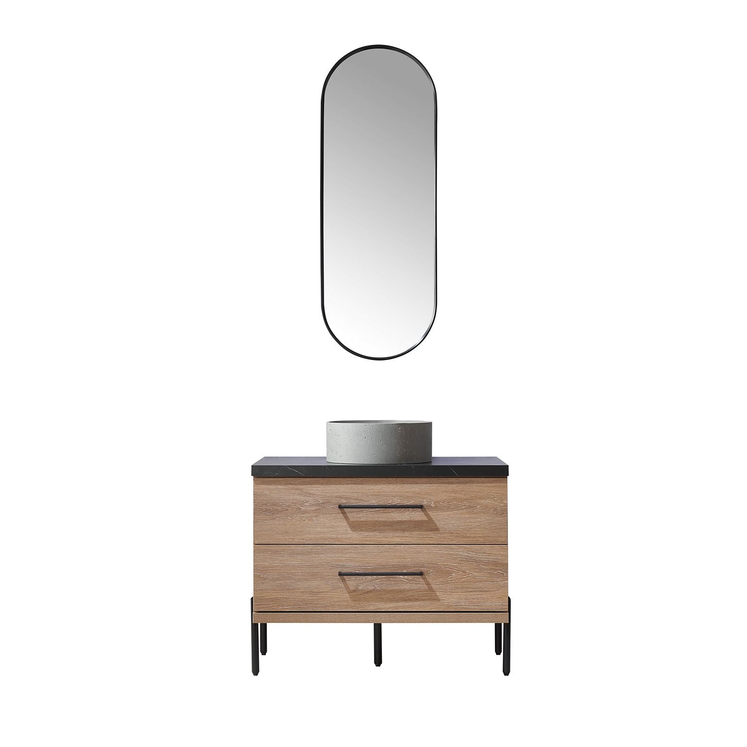 Trento 36" Single Sink Bath Vanity in North American Oak with Black Sintered Stone Top with Concrete Sink and Mirror