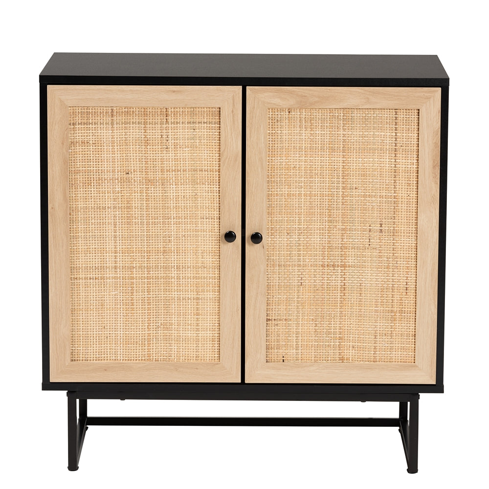 DECLAN MID-CENTURY MODERN ESPRESSO BROWN FINISHED WOOD AND NATURAL RATTAN 2-DOOR STORAGE CABINET