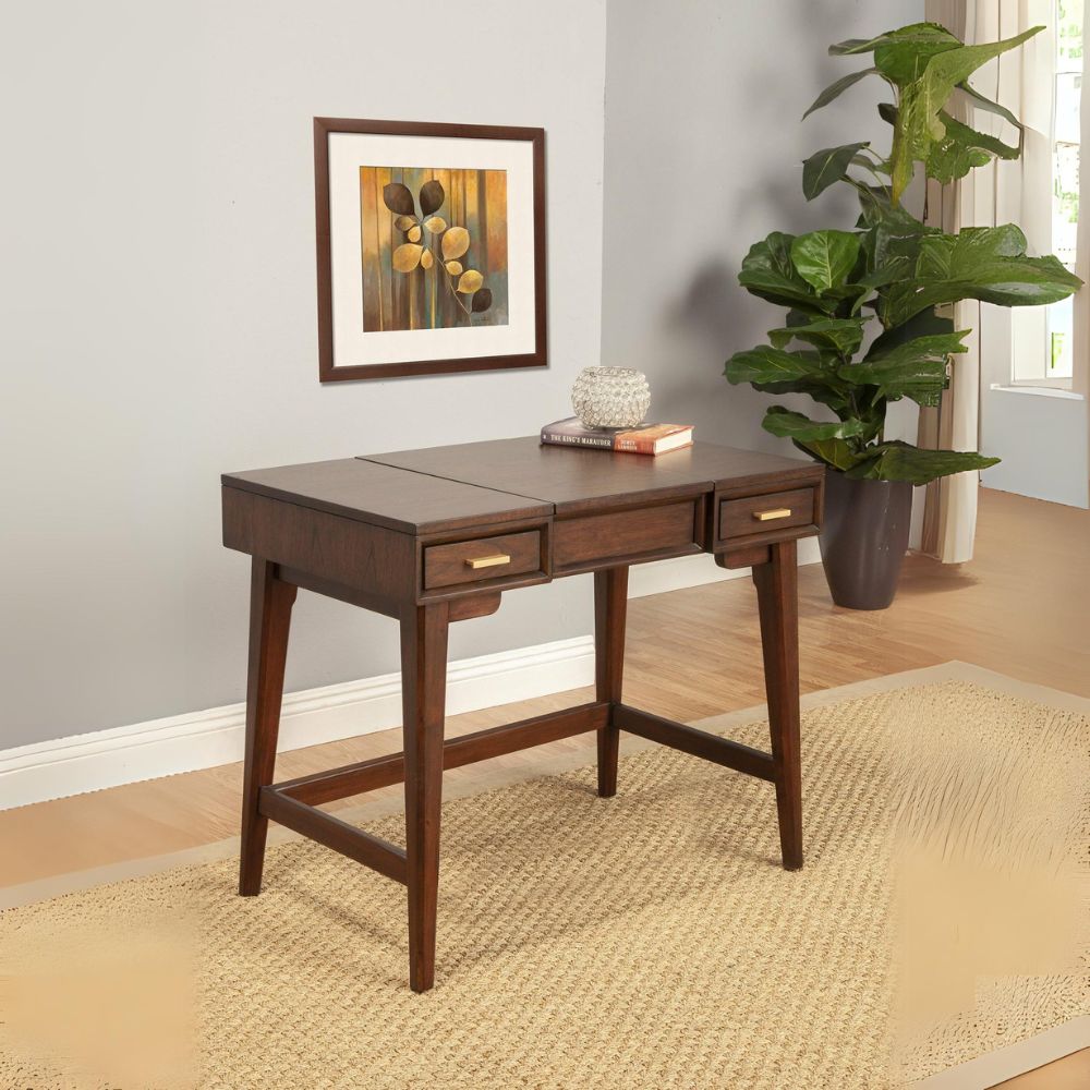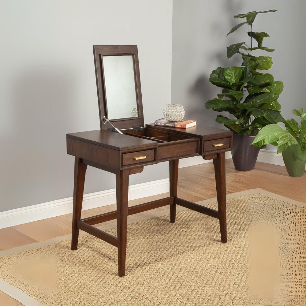 The streamlined design of the Gramercy mid-century bedroom vanity is compact, with a retractable mirror for a variety of makeup or jewelry functionality . Simplify your morning routine, retract the top of this vanity table to reveal a beautiful mirror and a selection of organized felt lined compartments, making everything available when you need it. When you’re finished, fold it back down to use it as a desk when its time to get some work done. Made of durable Mahogany wood solids and veneer, this bedroom vanity will adorn your home for years to come. Light assembly required. Coordinate with other pieces from the Gramercy bedroom collection.