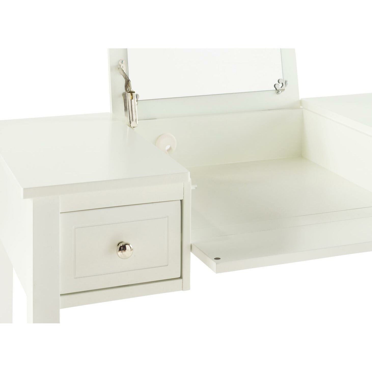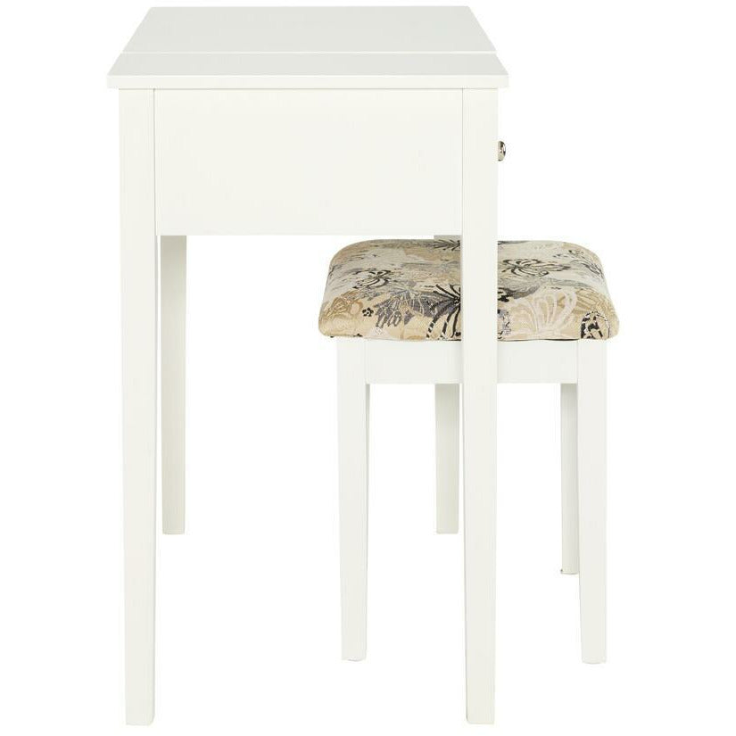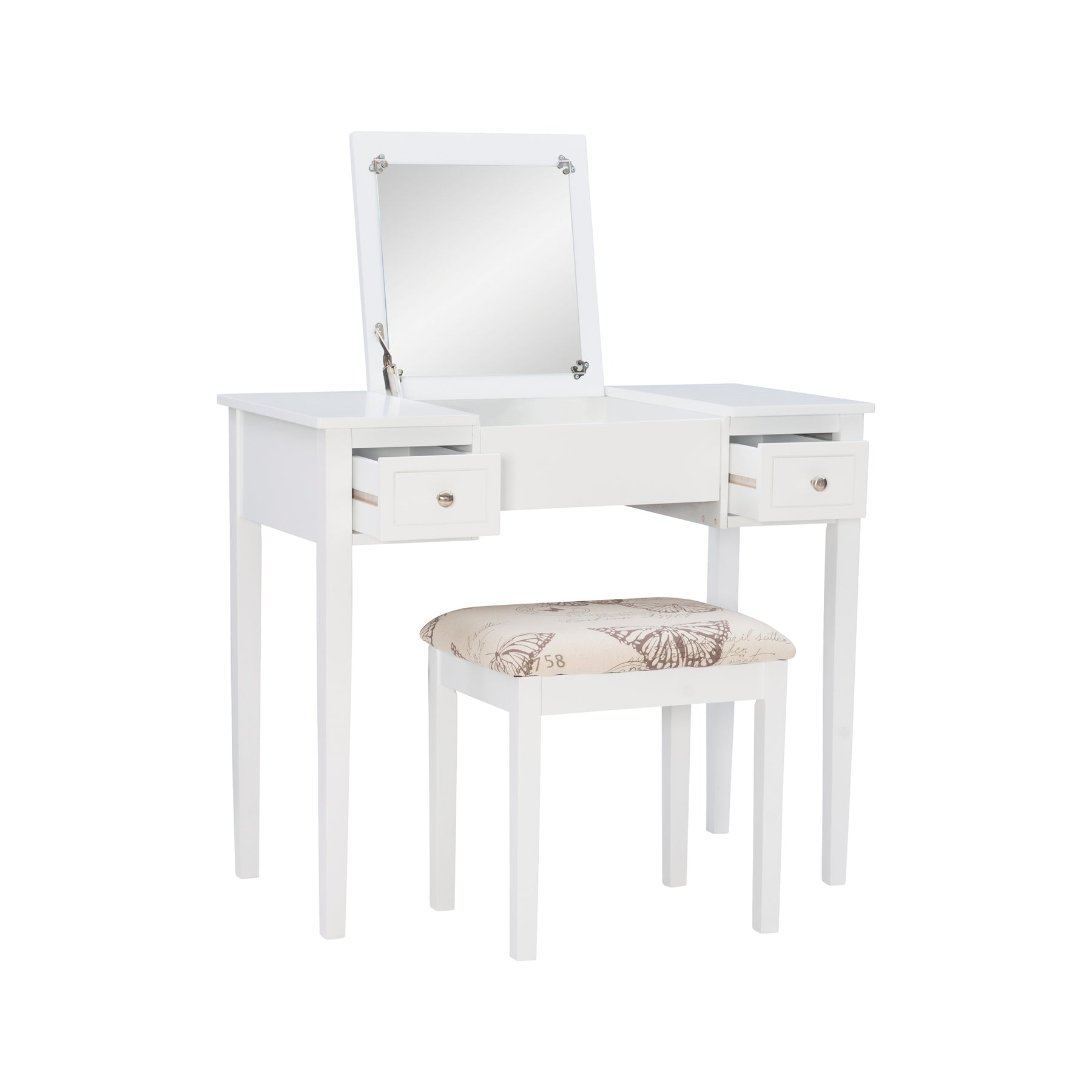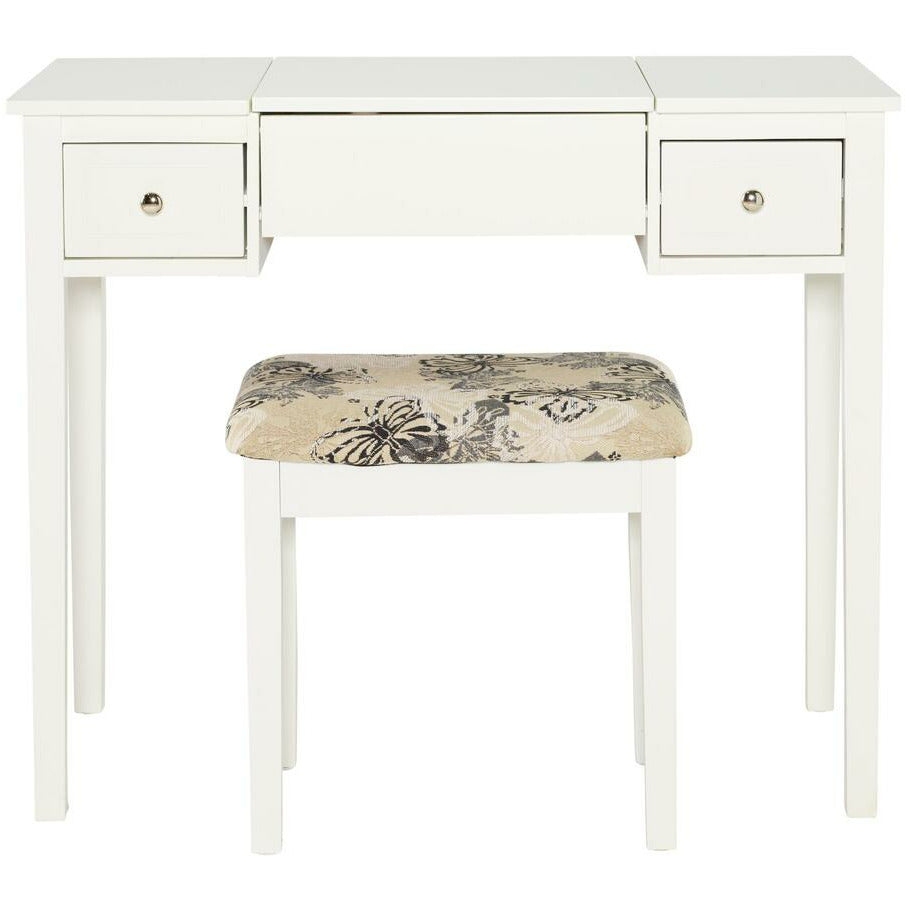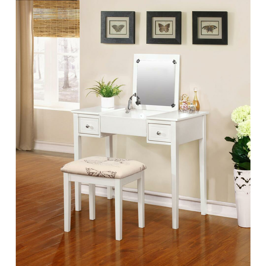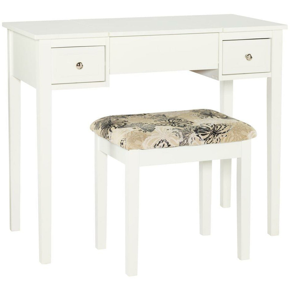 Add style and function to a bedroom or dressing area with the White Butterfly Vanity Set. The vanity features a flip top mirror with a safety stay hinge and generously sized drawers. The spacious table top has room for an array of cosmetic, jewelry and beauty supplies. Flip down front panel for easy access to your possessions. The vanity is complimented by a thickly padded upholstered stool. Ideal for teens and adults. Some Assembly Required