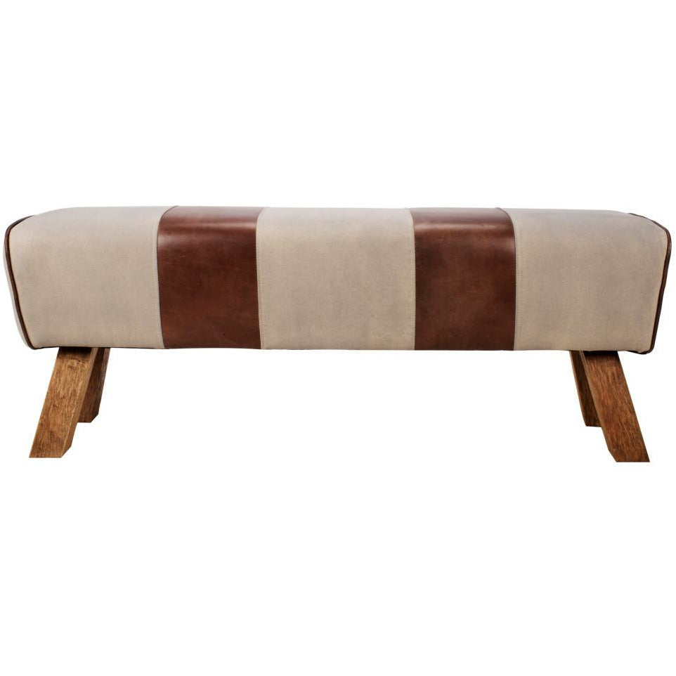Taking inspiration from the sports world, this eclectic bench is accurately made with leather and canvas. Careful with the gymnastics though, it's only 18"high!Wipe leather furniture down regularly with a clean, dry microfiber cloth. For stubborn patches of dust, dampen the cloth with a small amount of water. Do not let water soak into the leather.