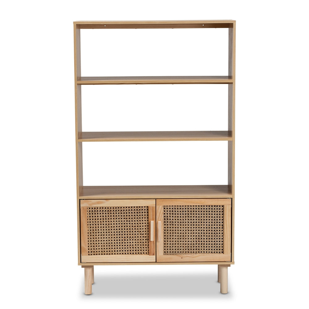 Faulkner Mid-Century Modern Natural Brown Finished Wood and Rattan 2-Door Bookcase