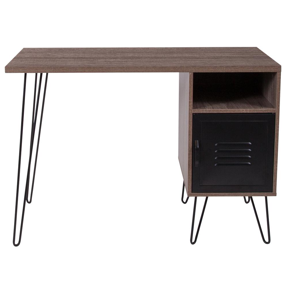 Woodridge Collection Rustic Wood Grain Finish Computer Desk with Metal Cabinet Door and Black Metal Legs