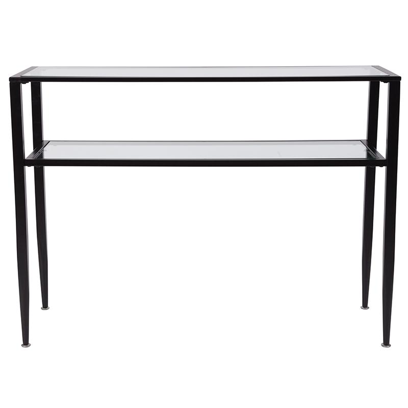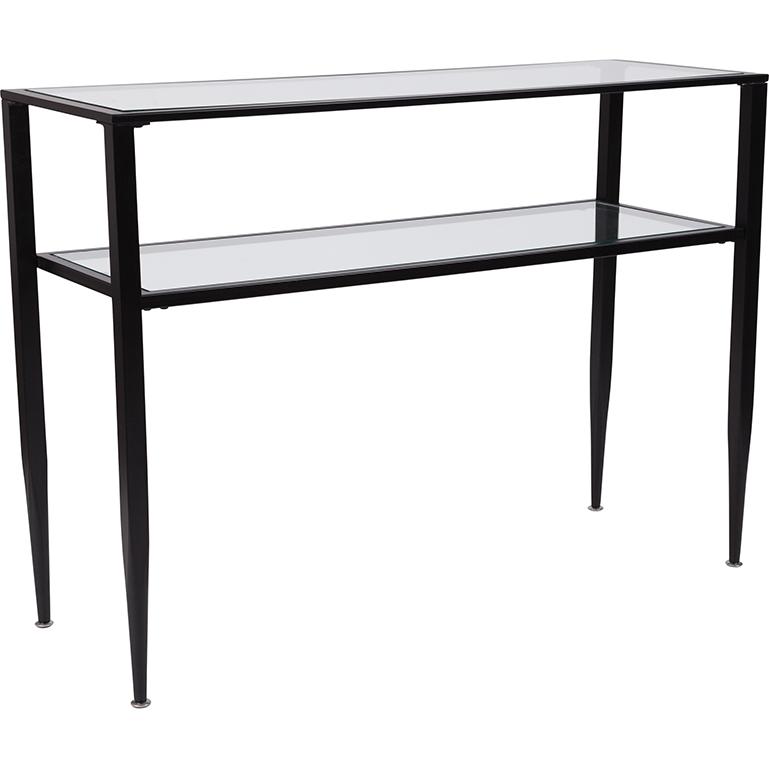 Newport Collection Glass Console Table with Shelves and Black Metal Frame
