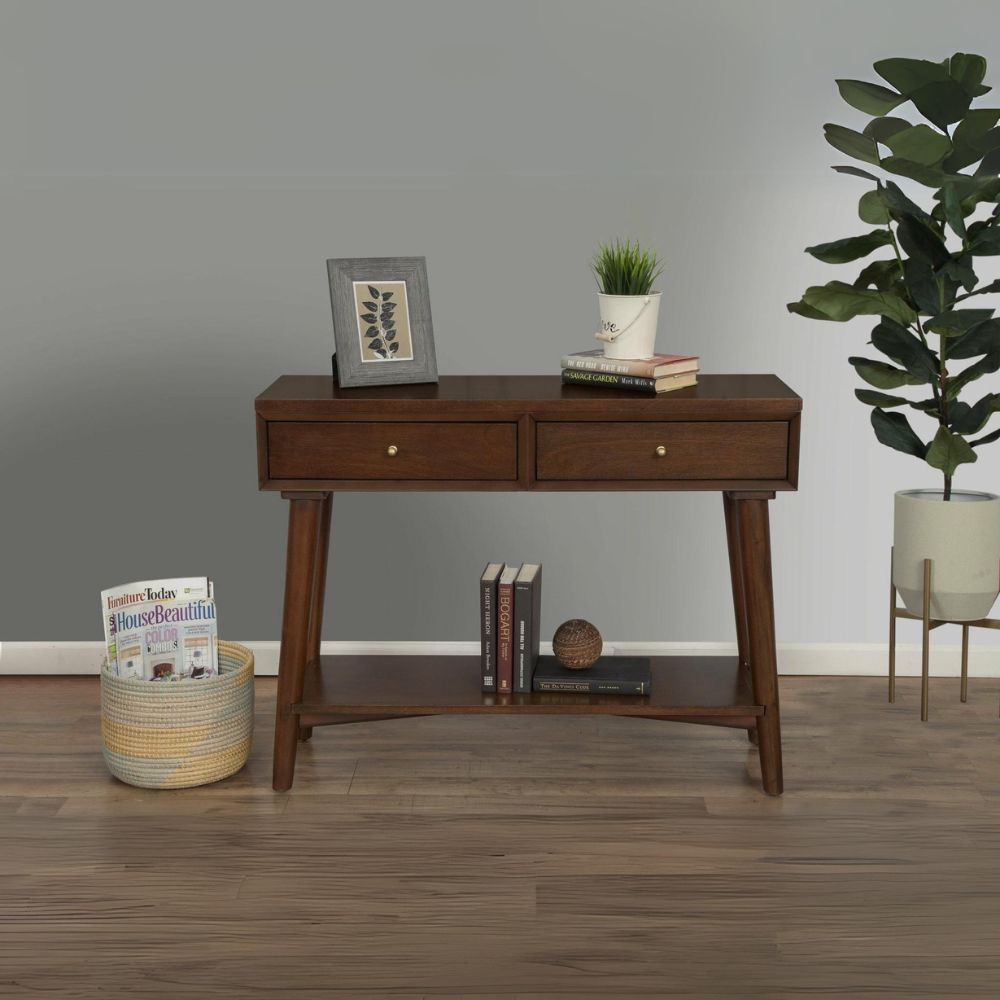 Streamlined and modern, the Flynn console table updates the aesthetic of your home. Mahogany wood solids and Okume veneer are finished in a rich walnut finish and blend effortlessly with your color scheme. This piece features flared legs, accent hardware, and 2 felt-lined drawers.