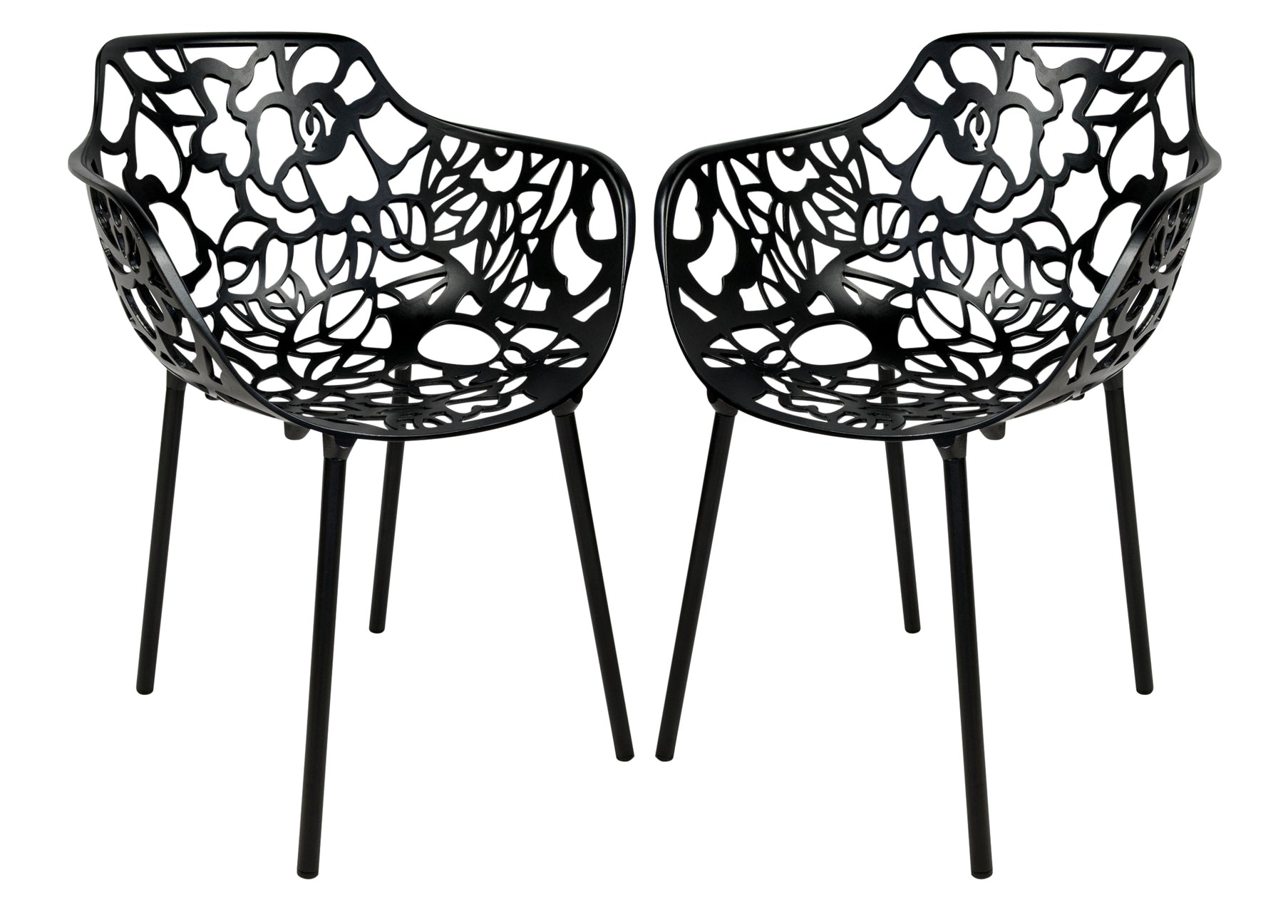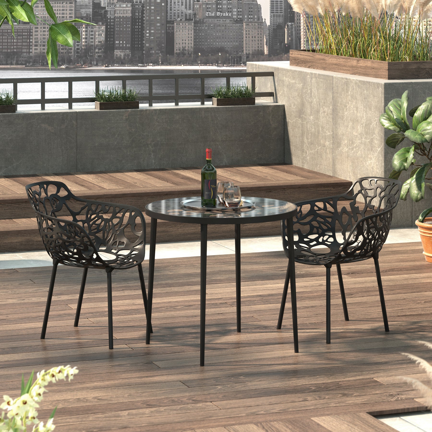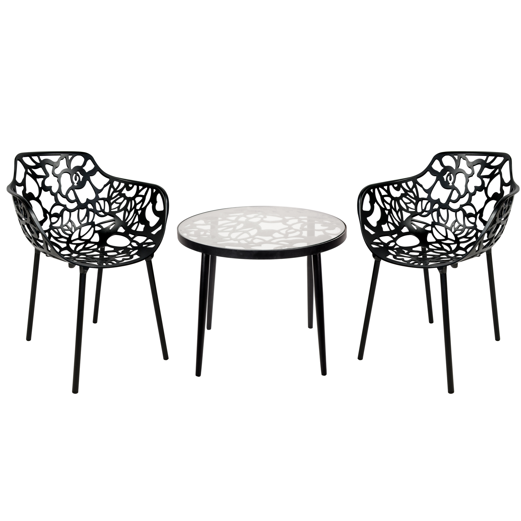 Devon Mid-Century Modern 3-Piece Aluminum Outdoor Patio Dining Set with Tempered Glass Top Table and 2 Stackable Flower Design Arm Chairs for Patio, Poolside, Balcony, and Backyard Garden