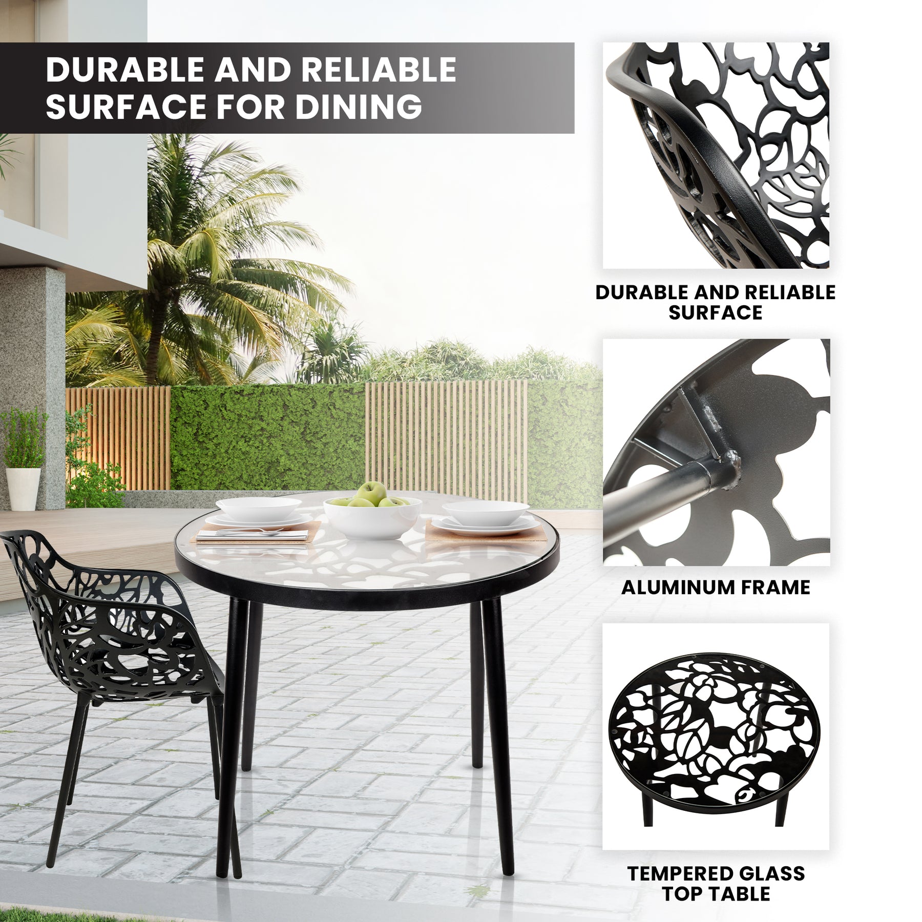 Introducing the stunning and captivating Devon Outdoor Patio Dining Set, a must-have for modern furniture enthusiasts. With its attractive flower design, this set is a true asset that will enhance the beauty of any home. This Dining Set excels when it comes to quality. The aluminum frame not only provides exceptional strength but also ensures the table and chair remain lightweight and easy to move around. This makes it convenient for rearranging furniture or accommodating additional guests. The Powder coated finish not only enhances the chair's visual appeal but also protects it from scratches and wear, guaranteeing its longevity. The table and chairs also come with plastic cap floor protectors, ensuring that your floors remain unscathed even when the chair is moved or rearranged. Meanwhile, the high-quality tempered glass top is a standout feature of the dining table. It not only adds a sleek and elegant look to the table but also provides a sturdy and reliable surface for dining. This dining set is UV-protected, making it resistant to the harmful effects of direct sun exposure. This feature ensures that the item's color and finish remain vibrant and intact, even when placed in areas with prolonged sun exposure. The Devon Outdoor Dining Set is more than just a furniture piece. They are expressions of style, elegance, and quality. The attractive flower design, durable construction, and versatility make them ideal choices for both indoor and outdoor settings. Elevate your decor and create a captivating dining area with this set. Create lasting memories with your loved ones as you gather around this exquisite dining set.