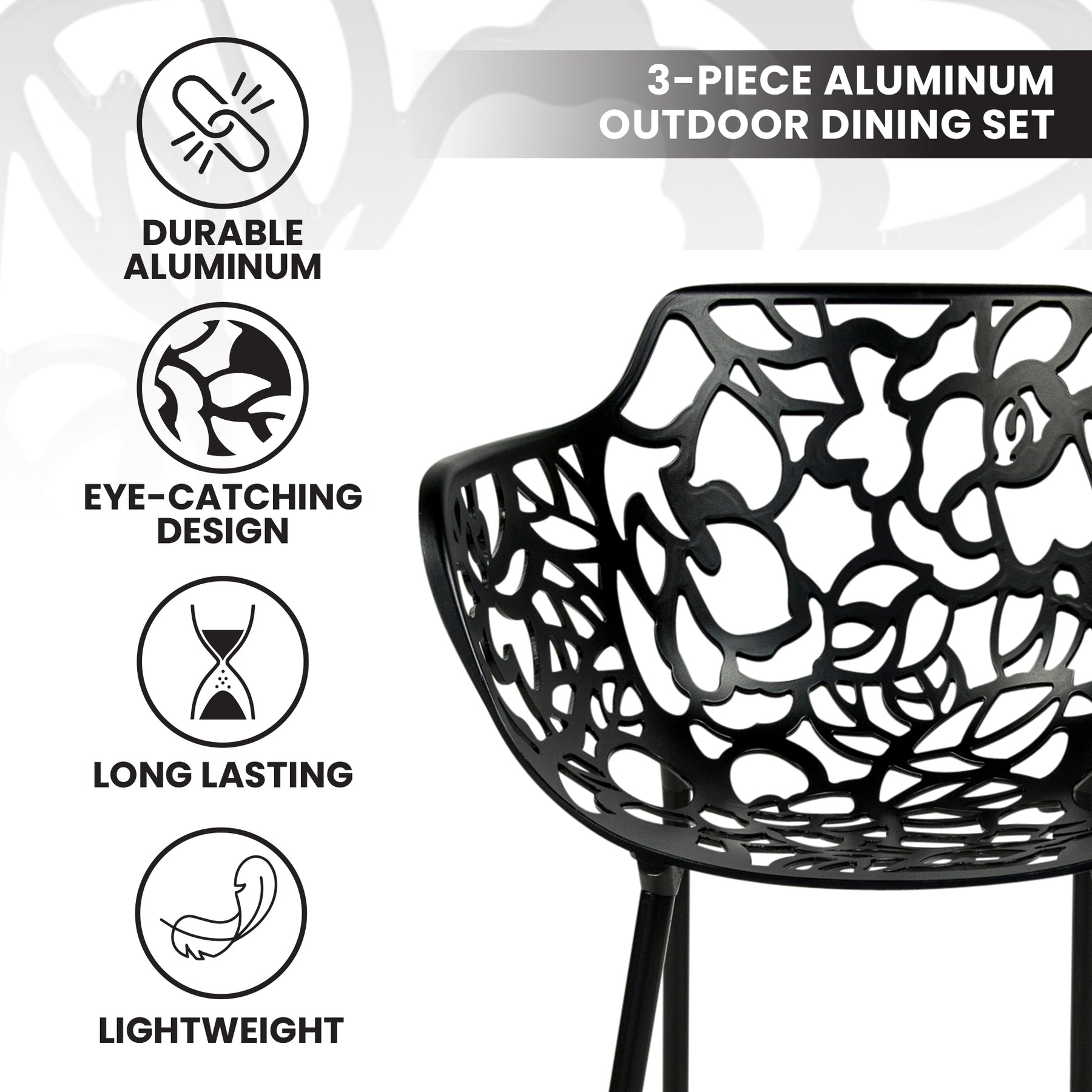 - The dining set features an attractive flower design, adding a touch of charm and elegance to your outdoor or indoor space. The unique and eye-catching design enhances the overall aesthetics of your home.