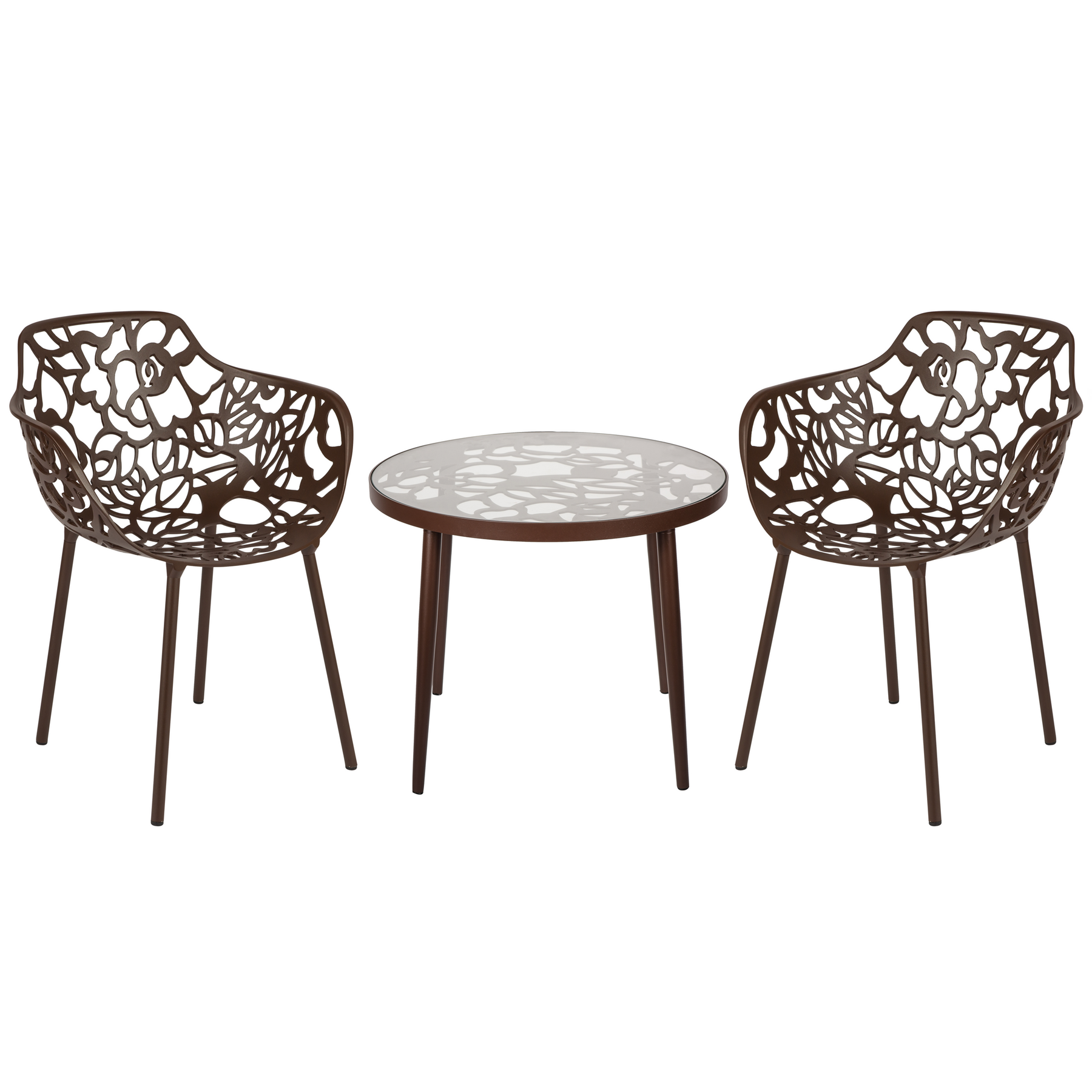 Devon Mid-Century Modern 3-Piece Aluminum Outdoor Patio Dining Set with Tempered Glass Top Table and 2 Stackable Flower Design Arm Chairs for Patio, Poolside, Balcony, and Backyard Garden