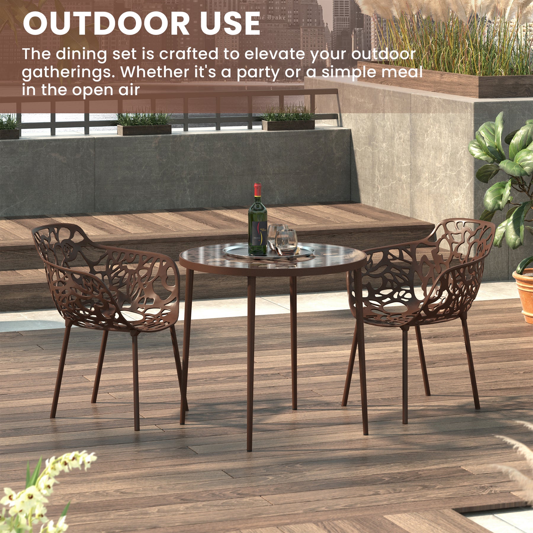 Introducing the stunning and captivating Devon Outdoor Patio Dining Set, a must-have for modern furniture enthusiasts. With its attractive flower design, this set is a true asset that will enhance the beauty of any home. This Dining Set excels when it comes to quality. The aluminum frame not only provides exceptional strength but also ensures the table and chair remain lightweight and easy to move around. This makes it convenient for rearranging furniture or accommodating additional guests. The Powder coated finish not only enhances the chair's visual appeal but also protects it from scratches and wear, guaranteeing its longevity. The table and chairs also come with plastic cap floor protectors, ensuring that your floors remain unscathed even when the chair is moved or rearranged. Meanwhile, the high-quality tempered glass top is a standout feature of the dining table. It not only adds a sleek and elegant look to the table but also provides a sturdy and reliable surface for dining. This dining set is UV-protected, making it resistant to the harmful effects of direct sun exposure. This feature ensures that the item's color and finish remain vibrant and intact, even when placed in areas with prolonged sun exposure. The Devon Outdoor Dining Set is more than just a furniture piece. They are expressions of style, elegance, and quality. The attractive flower design, durable construction, and versatility make them ideal choices for both indoor and outdoor settings. Elevate your decor and create a captivating dining area with this set. Create lasting memories with your loved ones as you gather around this exquisite dining set.