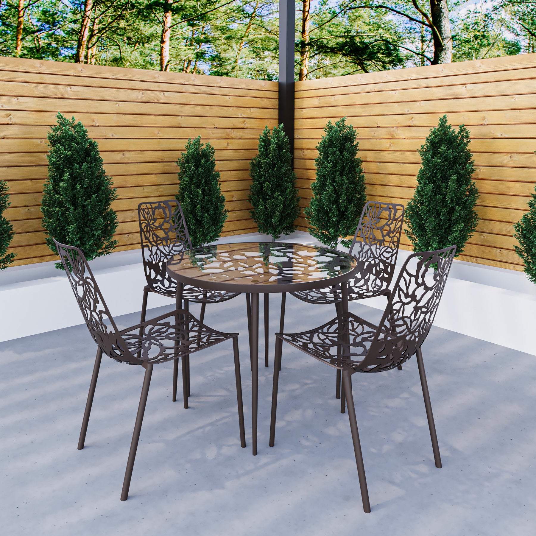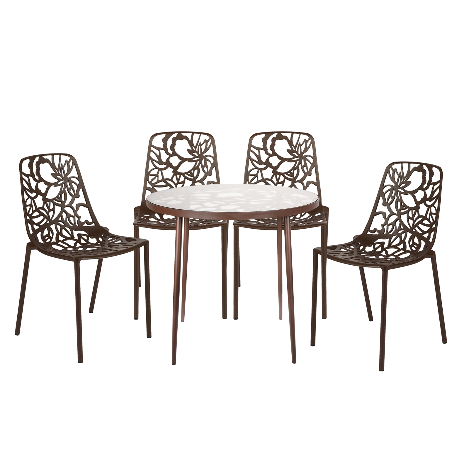 Introducing the stunning and captivating Devon Outdoor Patio Dining Set, a must-have for modern furniture enthusiasts. With its attractive flower design, this set is a true asset that will enhance the beauty of any home. This Dining Set excels when it comes to quality. The aluminum frame not only provides exceptional strength but also ensures the table and chair remain lightweight and easy to move around. This makes it convenient for rearranging furniture or accommodating additional guests. The Powder coated finish not only enhances the chair's visual appeal but also protects it from scratches and wear, guaranteeing its longevity. The table and chairs also come with plastic cap floor protectors, ensuring that your floors remain unscathed even when the chair is moved or rearranged. Meanwhile, the high-quality tempered glass top is a standout feature of the dining table. It not only adds a sleek and elegant look to the table but also provides a sturdy and reliable surface for dining. This dining set is UV-protected, making it resistant to the harmful effects of direct sun exposure. This feature ensures that the item's color and finish remain vibrant and intact, even when placed in areas with prolonged sun exposure. The Devon Outdoor Dining Set is more than just a furniture piece. They are expressions of style, elegance, and quality. The attractive flower design, durable construction, and versatility make them ideal choices for both indoor and outdoor settings. Elevate your decor and create a captivating dining area with this set. Create lasting memories with your loved ones as you gather around this exquisite dining set.