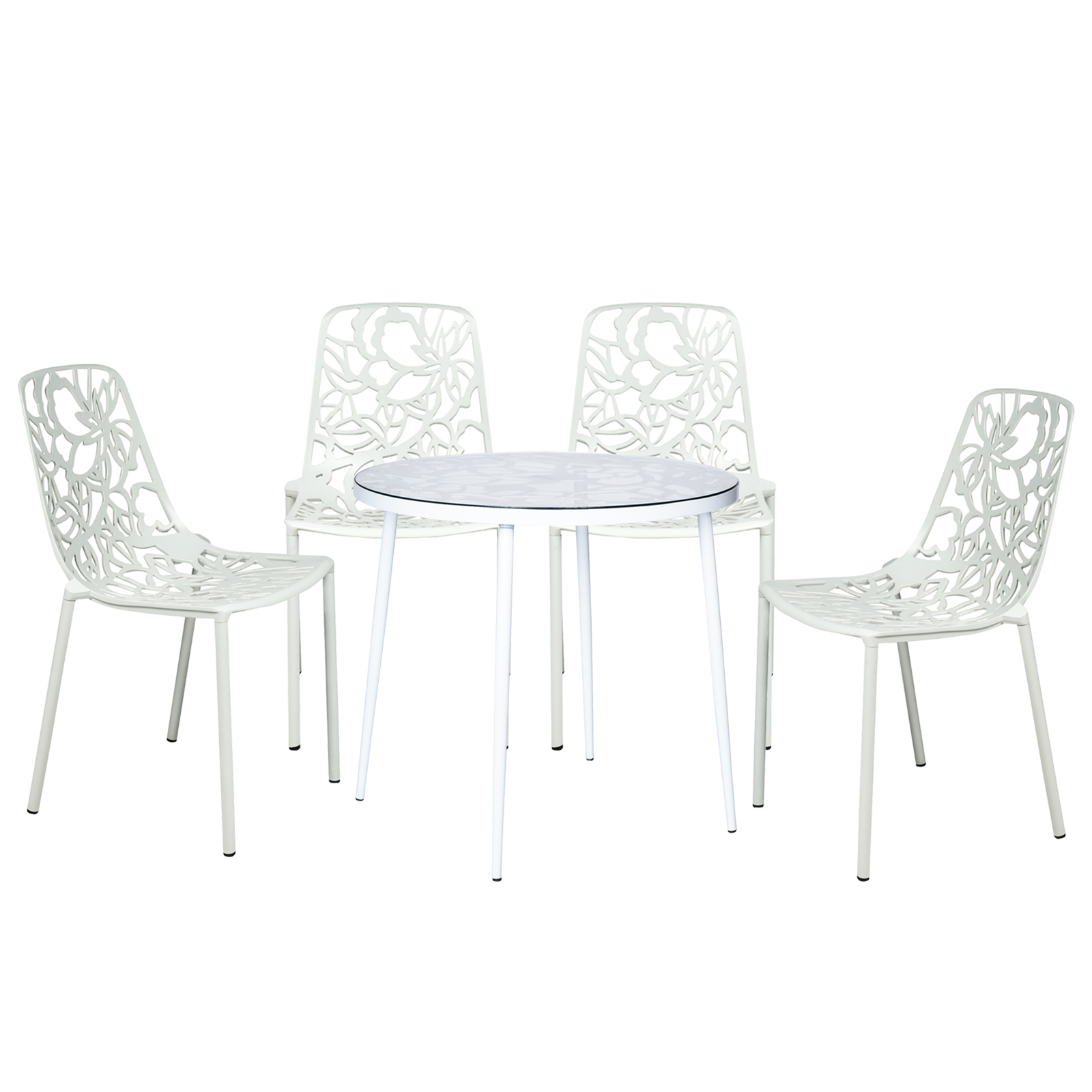 Devon Mid-Century Modern 5-Piece Aluminum Outdoor Patio Dining Set with Tempered Glass Top Table and 4 Stackable Flower Design Chairs for Patio, Poolside, Balcony, and Backyard Garden