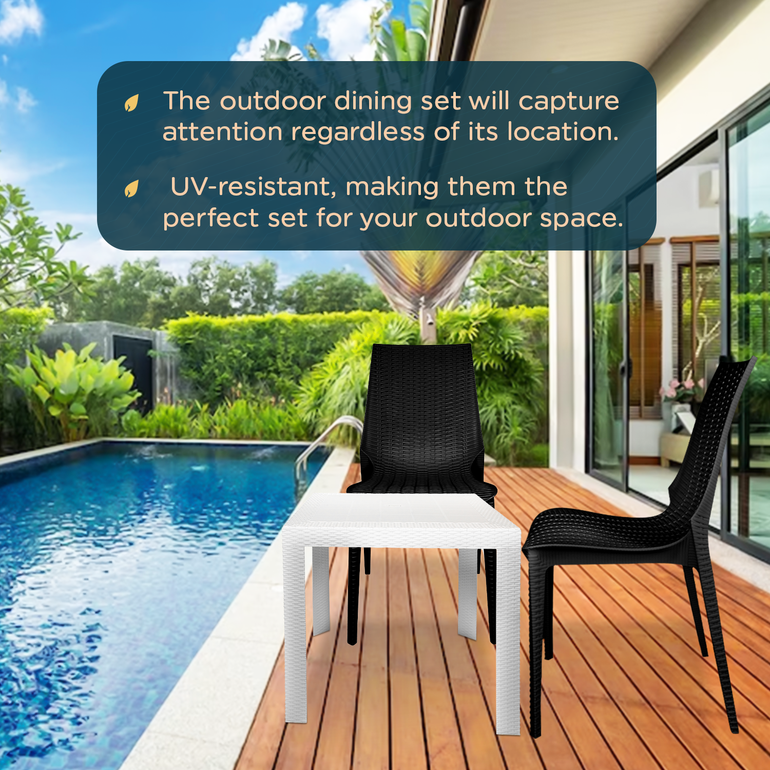 - The outdoor dining set will capture attention regardless of its location. It will elevate the aesthetic appeal of your porch, patio, or pool area by adding a touch of sophistication.