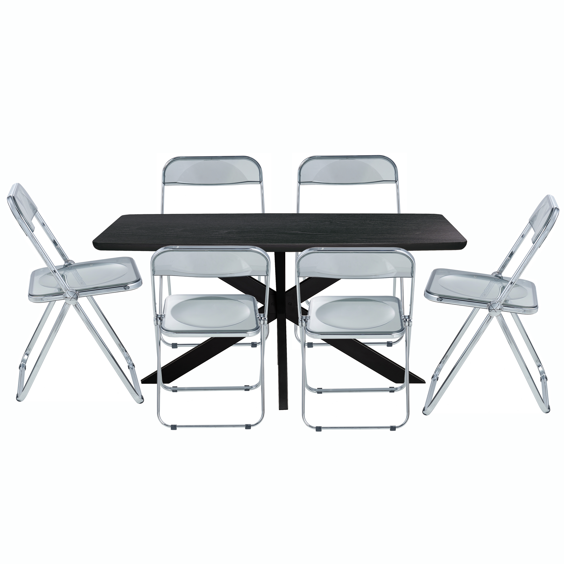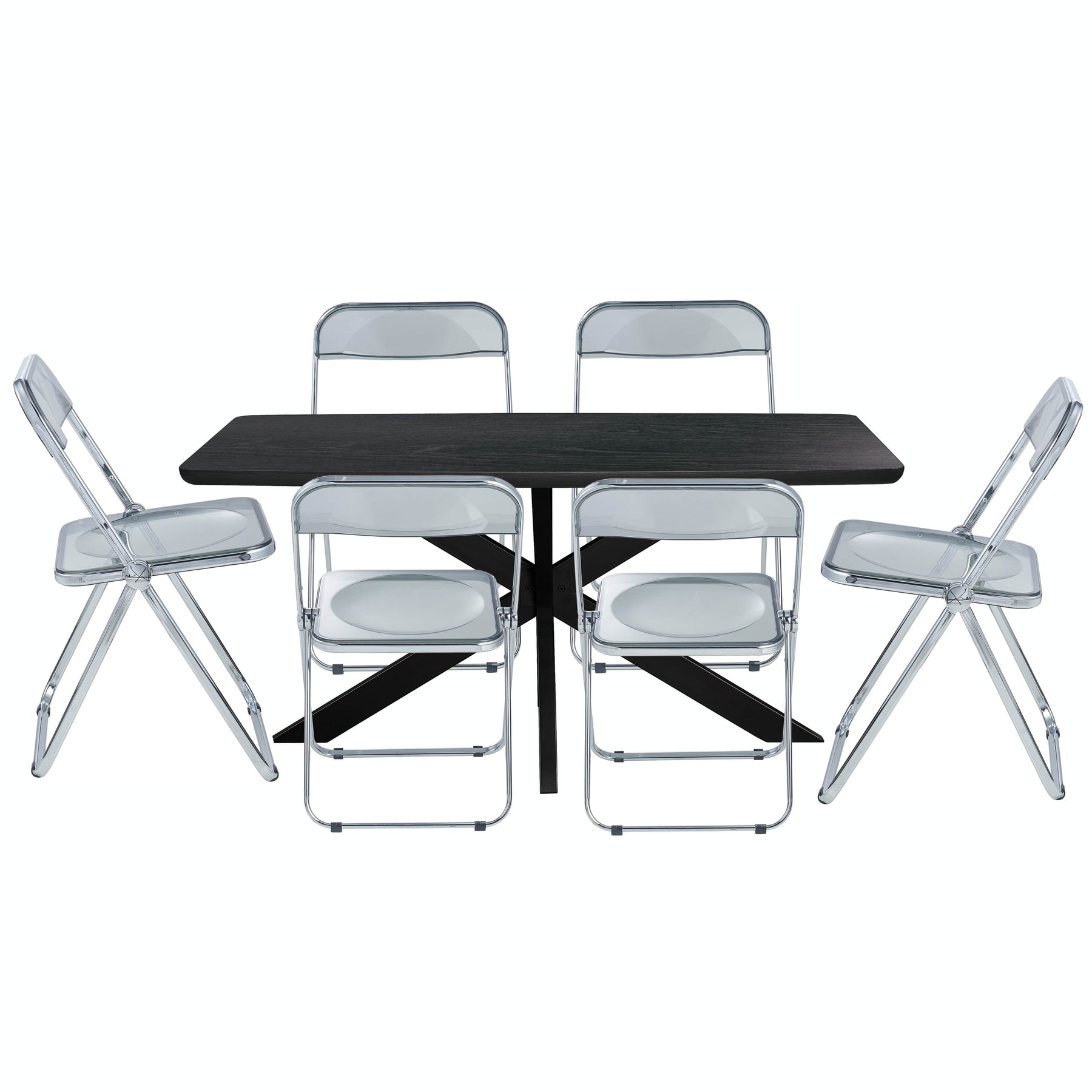 Lawrence 7-Piece Acrylic Folding Dining Chair and Rectangular Dining Table with Geometic Base Set in Transparent Black