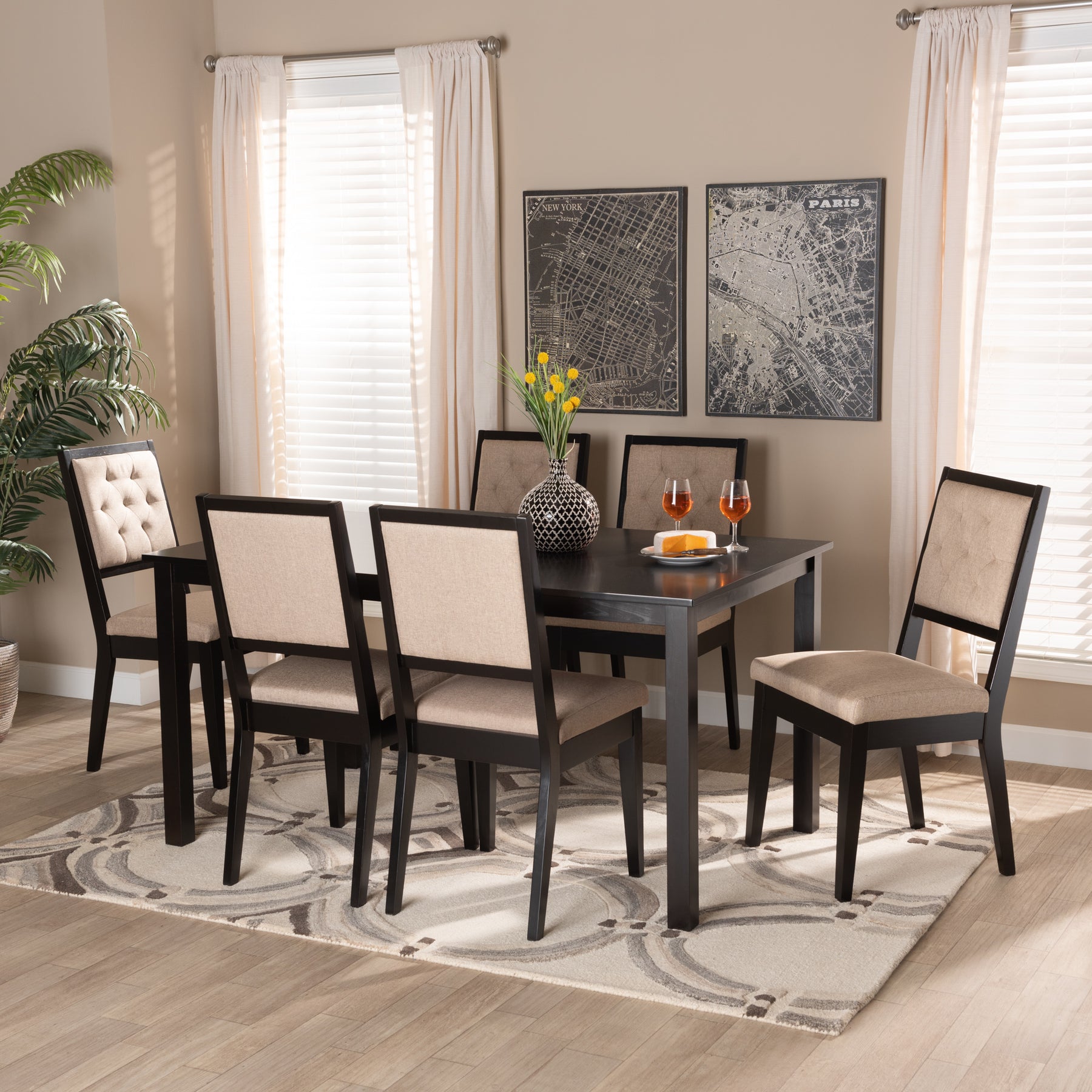 Skyline Decor Suvi Modern and Contemporary Sand Fabric Upholstered and Dark Brown Finished Wood 7-Piece Dining Set