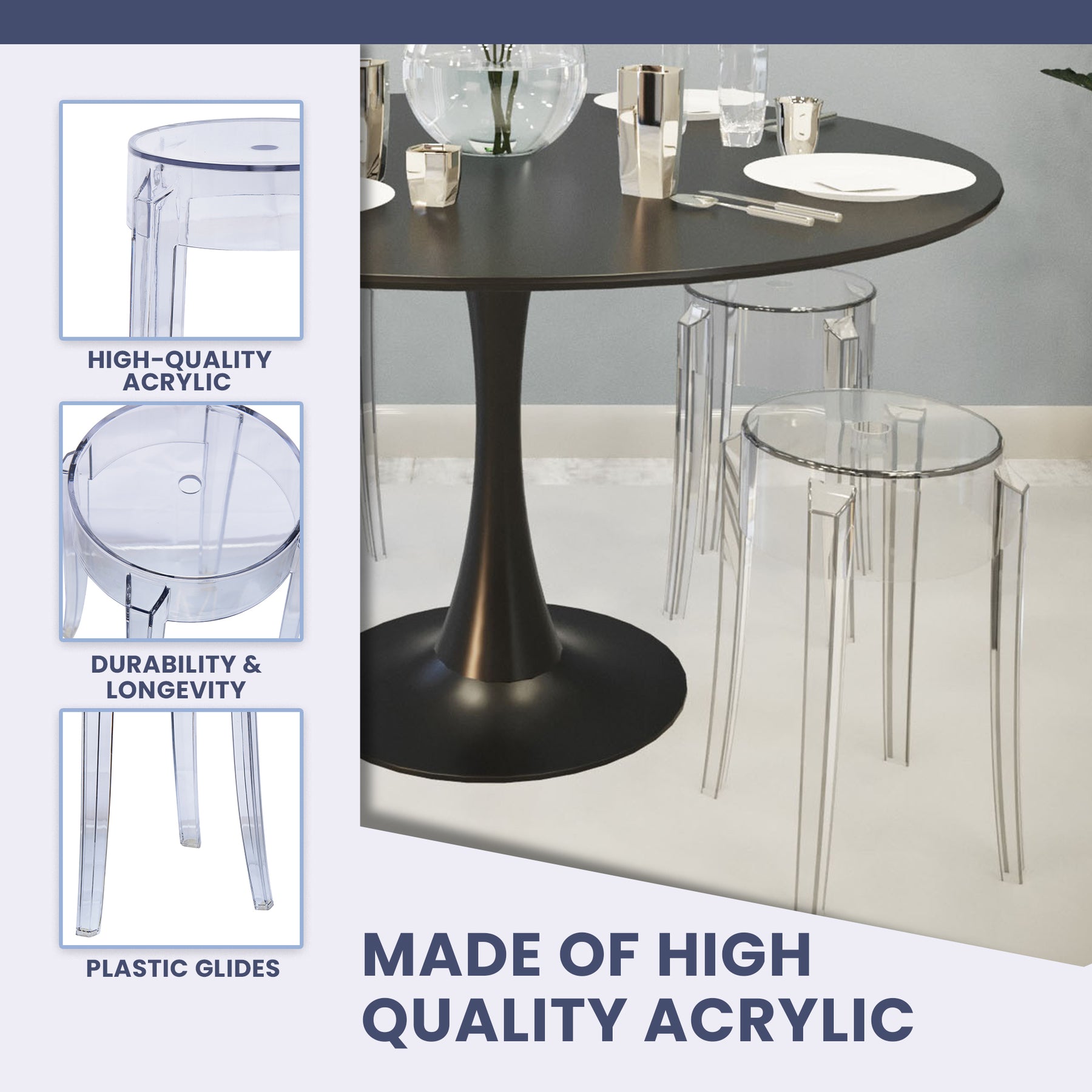 - Whether you have a formal dining room or a casual kitchen, this dining stool’s acrylic transparent design adds a touch of elegance and sophistication. This modern plastic stool is the perfect choice for any home or commercial space.