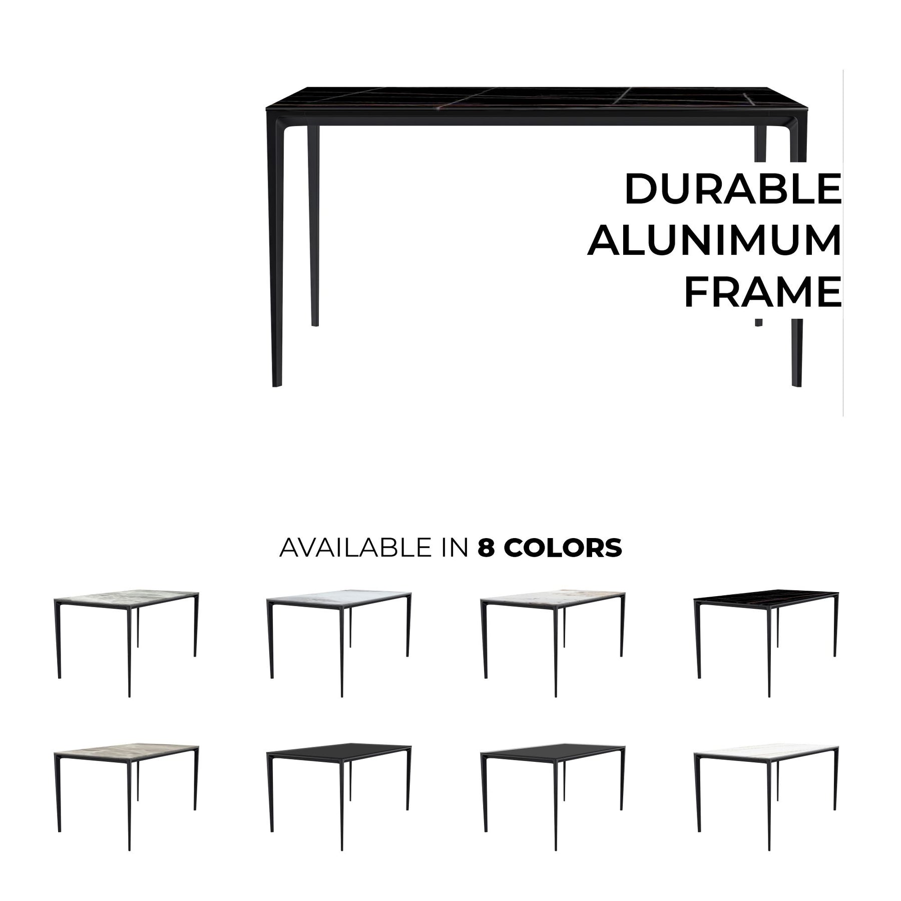 Discover the sleek and functional Avo Series Modern Dining Table by Skyline, a sophisticated addition to your dining space that seamlessly combines contemporary elegance with exceptional durability. Crafted with a sleek black aluminum base and a generously wide rectangular top available in luxurious sintered stone or sleek glass, this table is designed to captivate. Its fixed height design ensures stability, while the easy-to-clean surface simplifies maintenance for everyday convenience. The assembly process is straightforward, featuring a type of installation using grub screws to guarantee steadfast stability. Elevate your dining experience to new heights of style and functionality with the Avo Series Dining Table, where every meal becomes a delightful celebration of modern living.