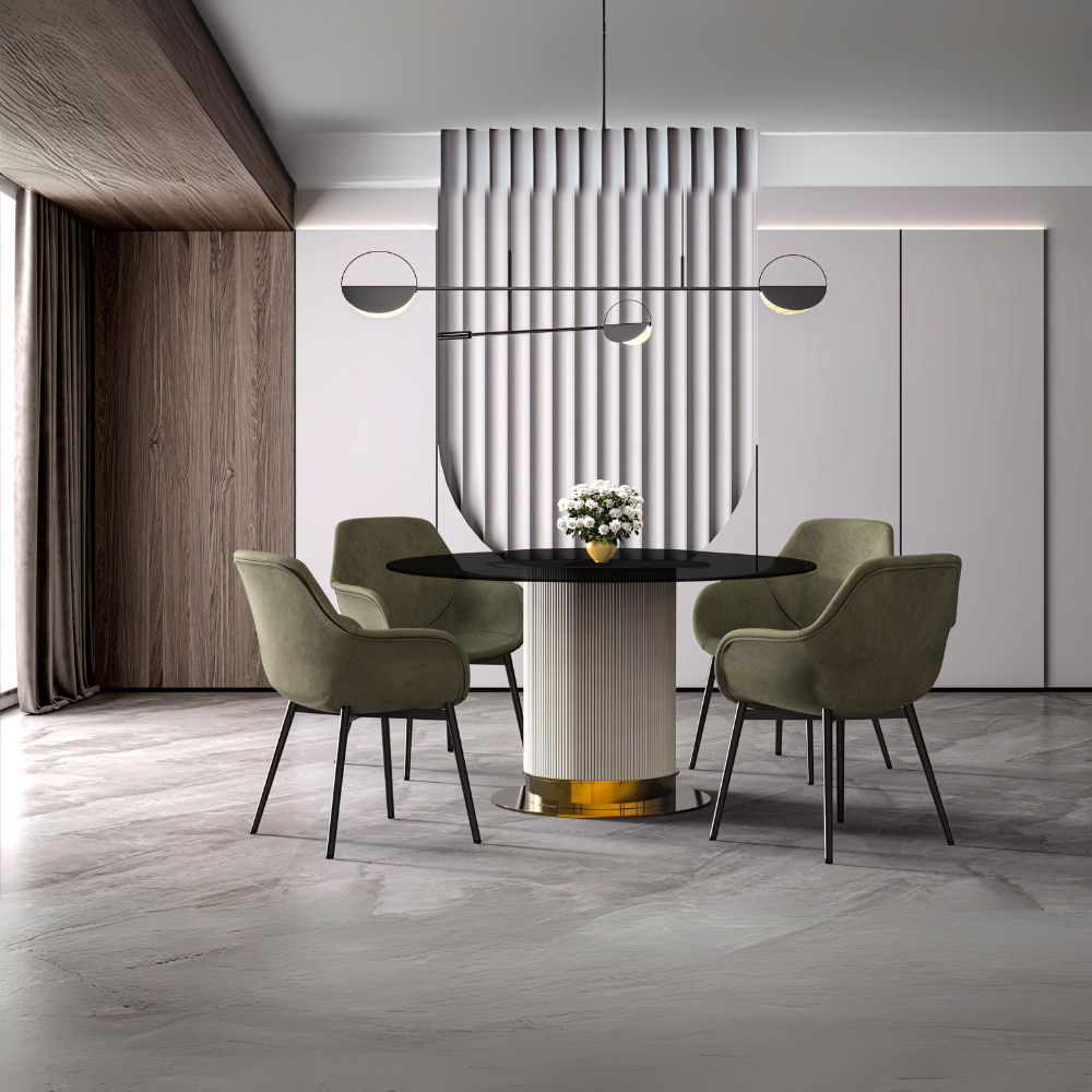 - Our contemporary dining table's generous round surface not only provides ample space for placing dishes and dining essentials, but also encourages easy conversation and social interaction among diners. The rounded shape creates a cozy and inclusive atmosphere.