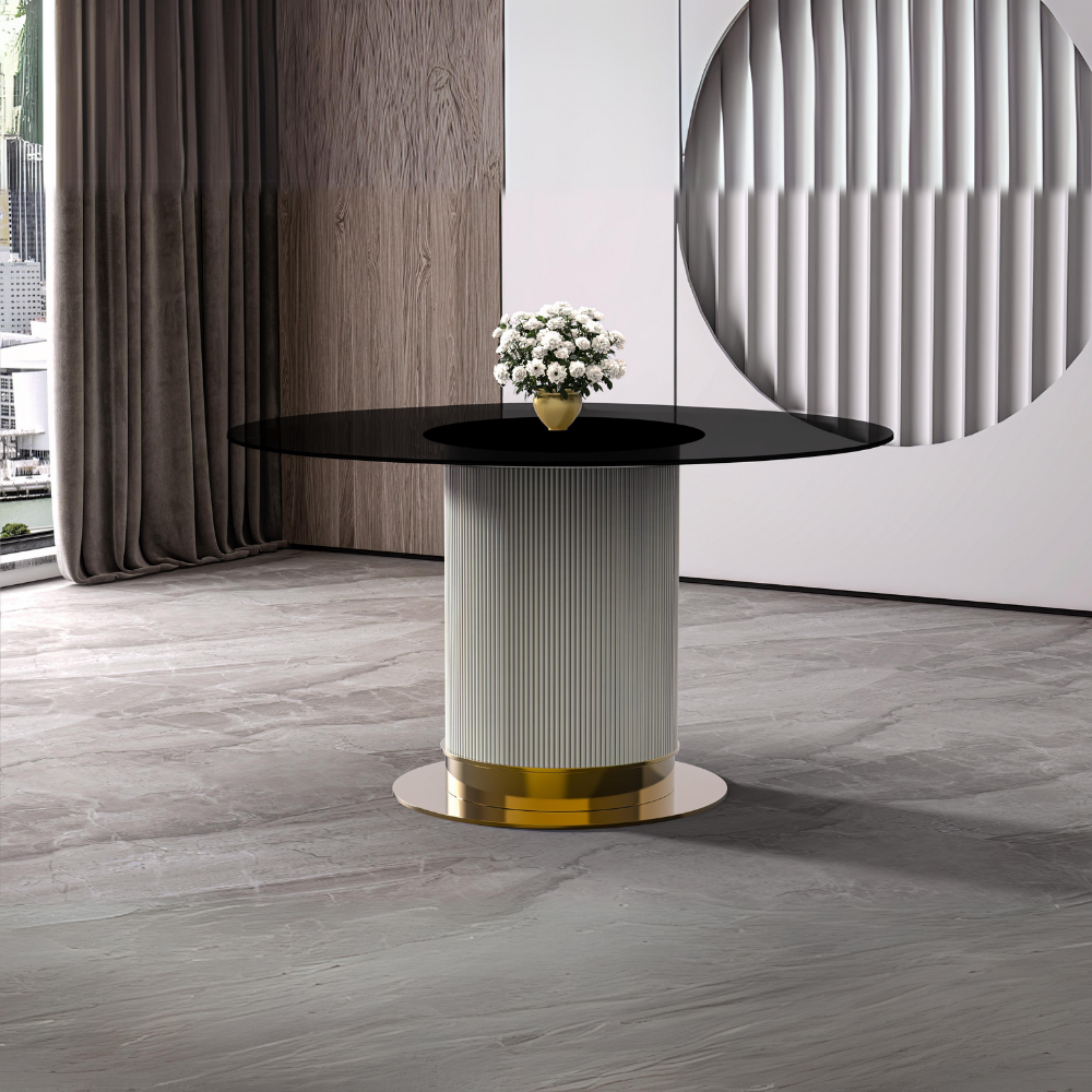 - Choose between our durable sintered stone top, known for its strength against heat and scratches, or the elegant glass top that adds sophistication due to its transparent design. Both options offer lasting quality and style to elevate your dining experience.