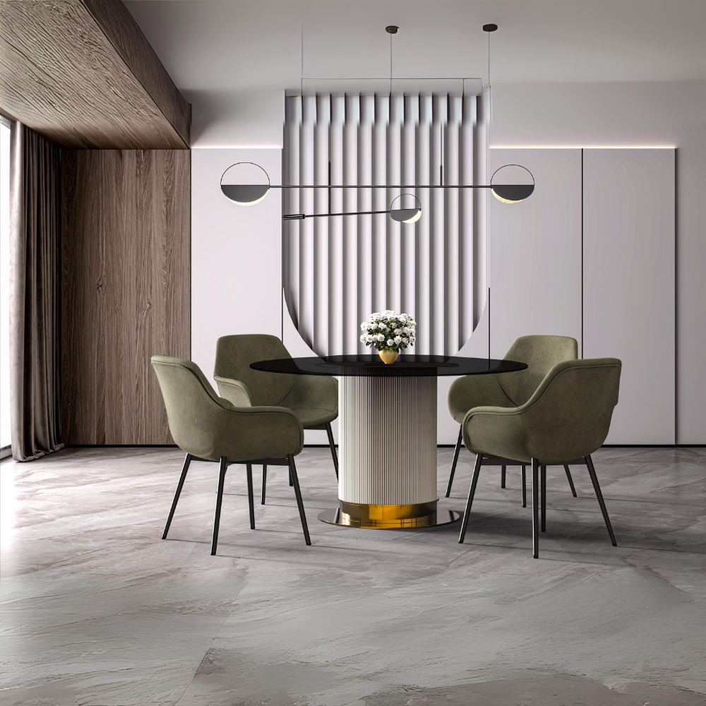 • Choose between our durable sintered stone top, known for its strength against heat and scratches, or the elegant glass top that adds sophistication due to its transparent design. Both options offer lasting quality and style to elevate your dining experience.