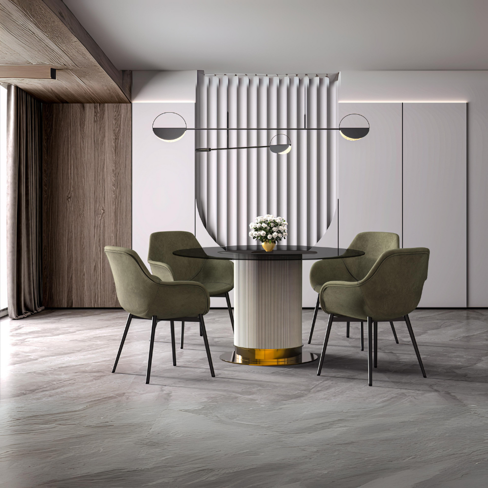 - Choose between our durable sintered stone top, known for its strength against heat and scratches, or the elegant glass top that adds sophistication due to its transparent design. Both options offer lasting quality and style to elevate your dining experience.