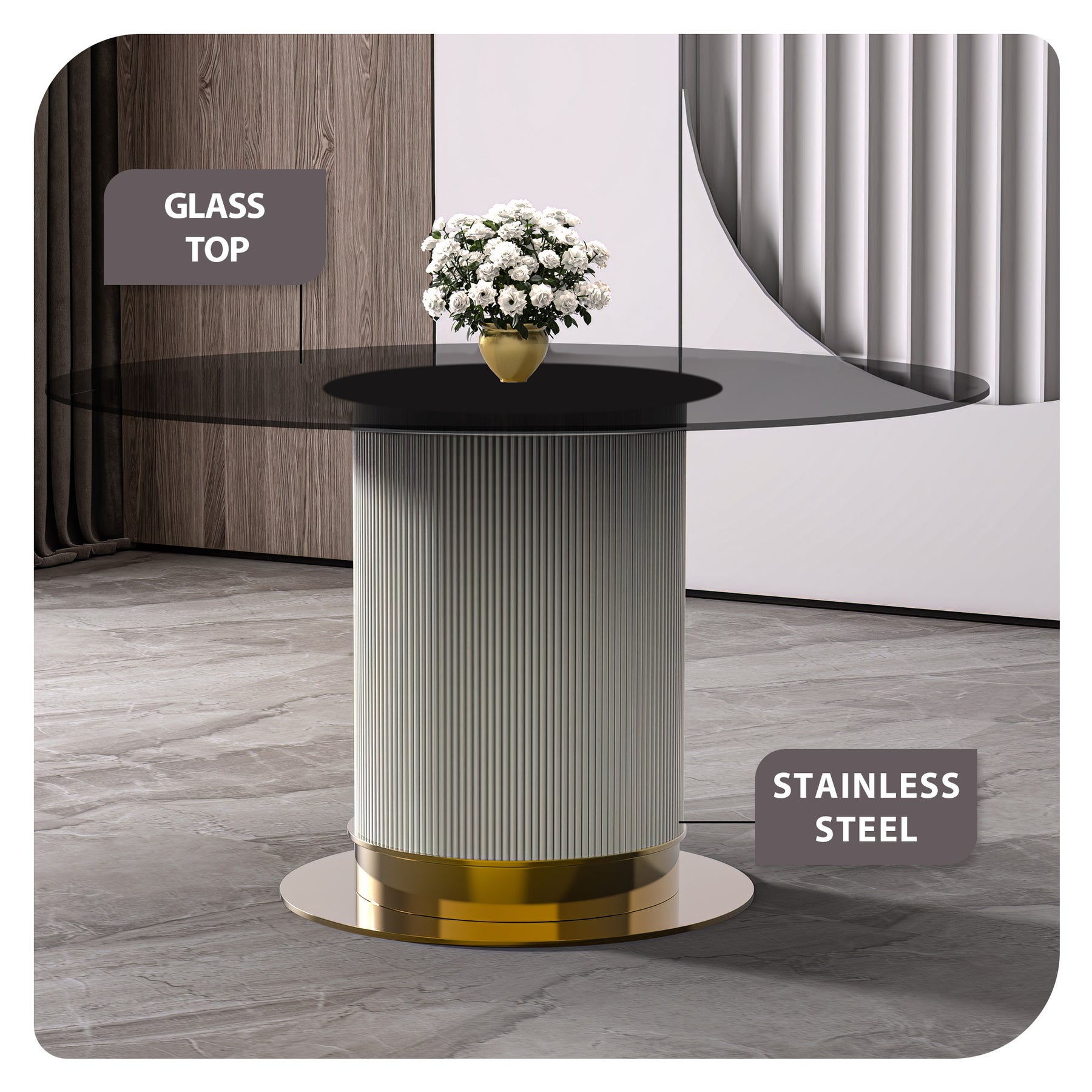 - Our contemporary dining table's generous round surface not only provides ample space for placing dishes and dining essentials, but also encourages easy conversation and social interaction among diners. The rounded shape creates a cozy and inclusive atmosphere.