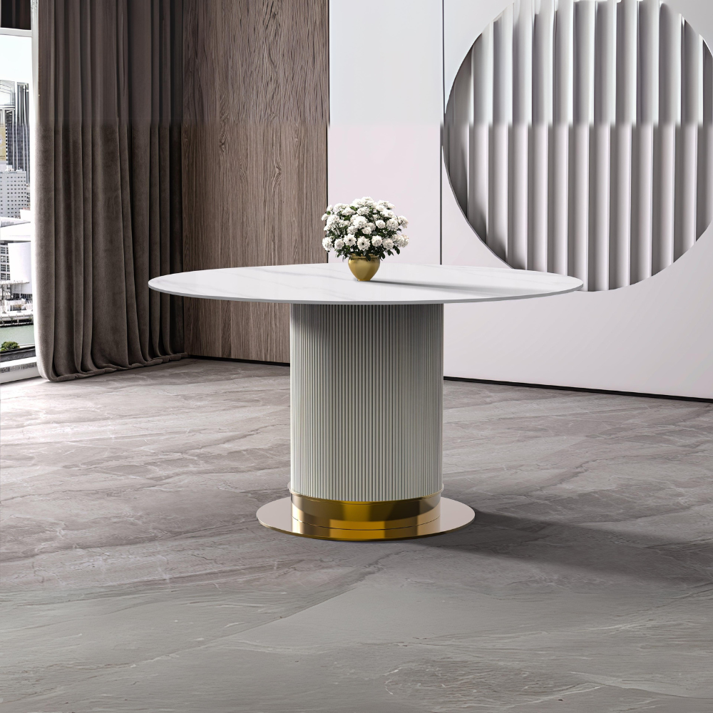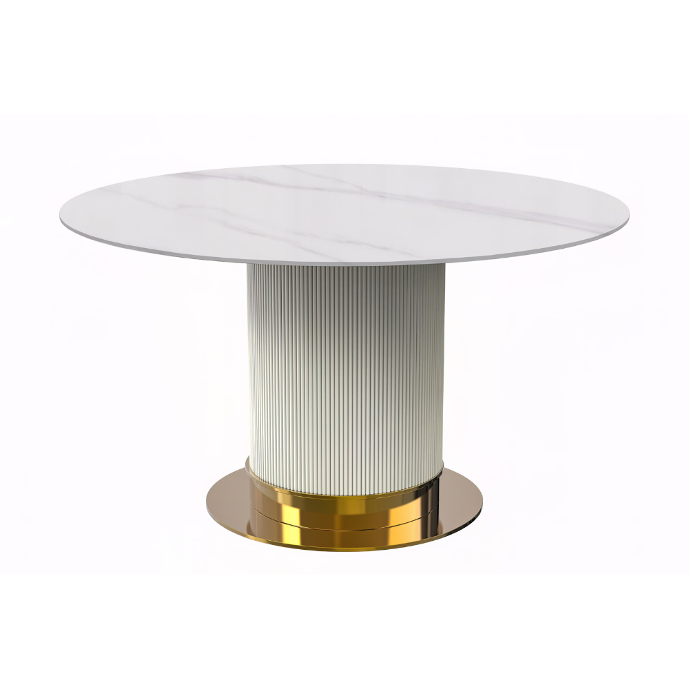 Jexis Series Round Dining Table White\Gold Base with 60 Round Solid White Sintered Stone Top