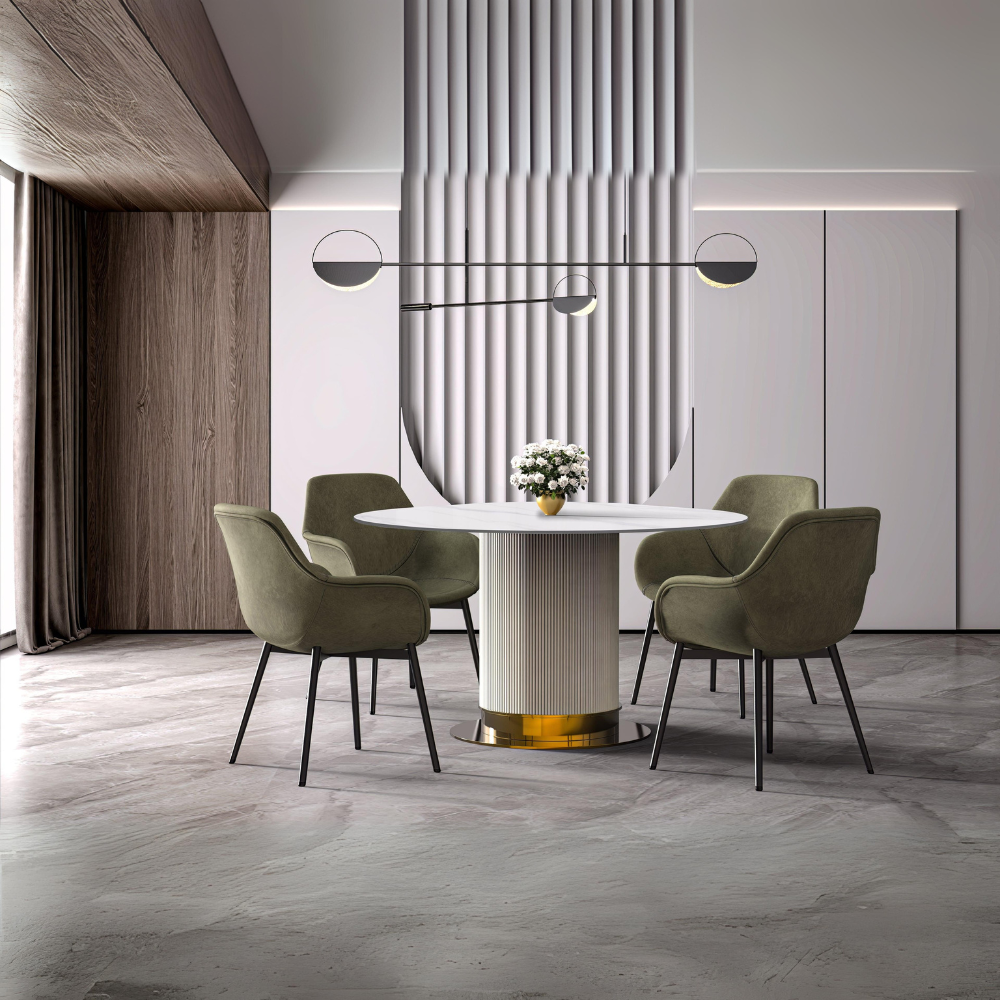 - Our contemporary dining table's generous round surface not only provides ample space for placing dishes and dining essentials, but also encourages easy conversation and social interaction among diners. The rounded shape creates a cozy and inclusive atmosphere.