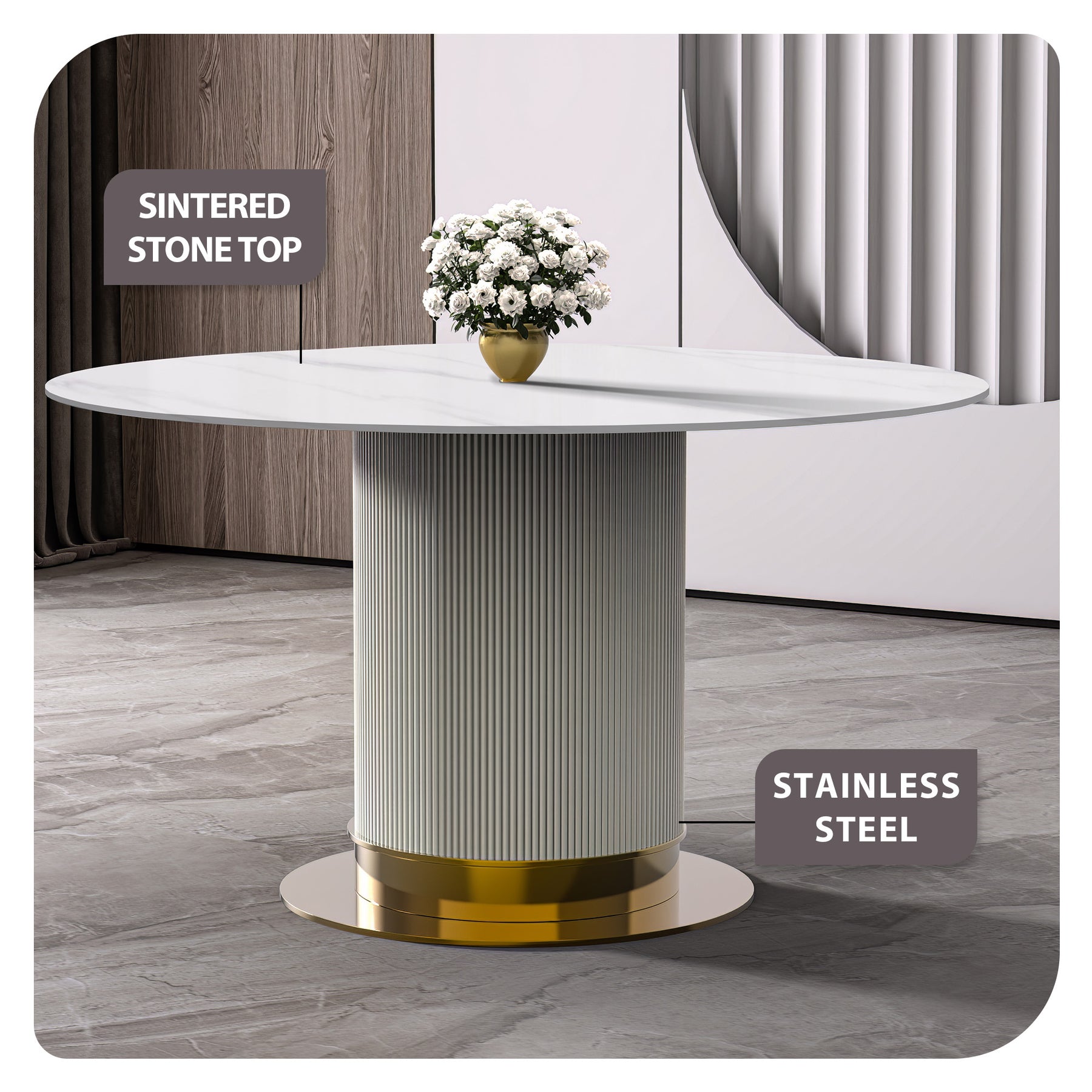 - Choose between our durable sintered stone top, known for its strength against heat and scratches, or the elegant glass top that adds sophistication due to its transparent design. Both options offer lasting quality and style to elevate your dining experience.