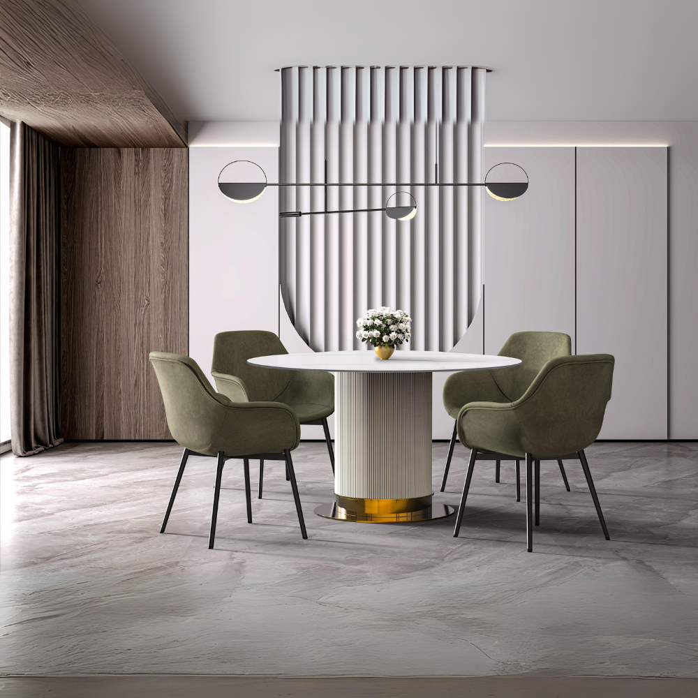 - Our contemporary dining table's generous round surface not only provides ample space for placing dishes and dining essentials, but also encourages easy conversation and social interaction among diners. The rounded shape creates a cozy and inclusive atmosphere.