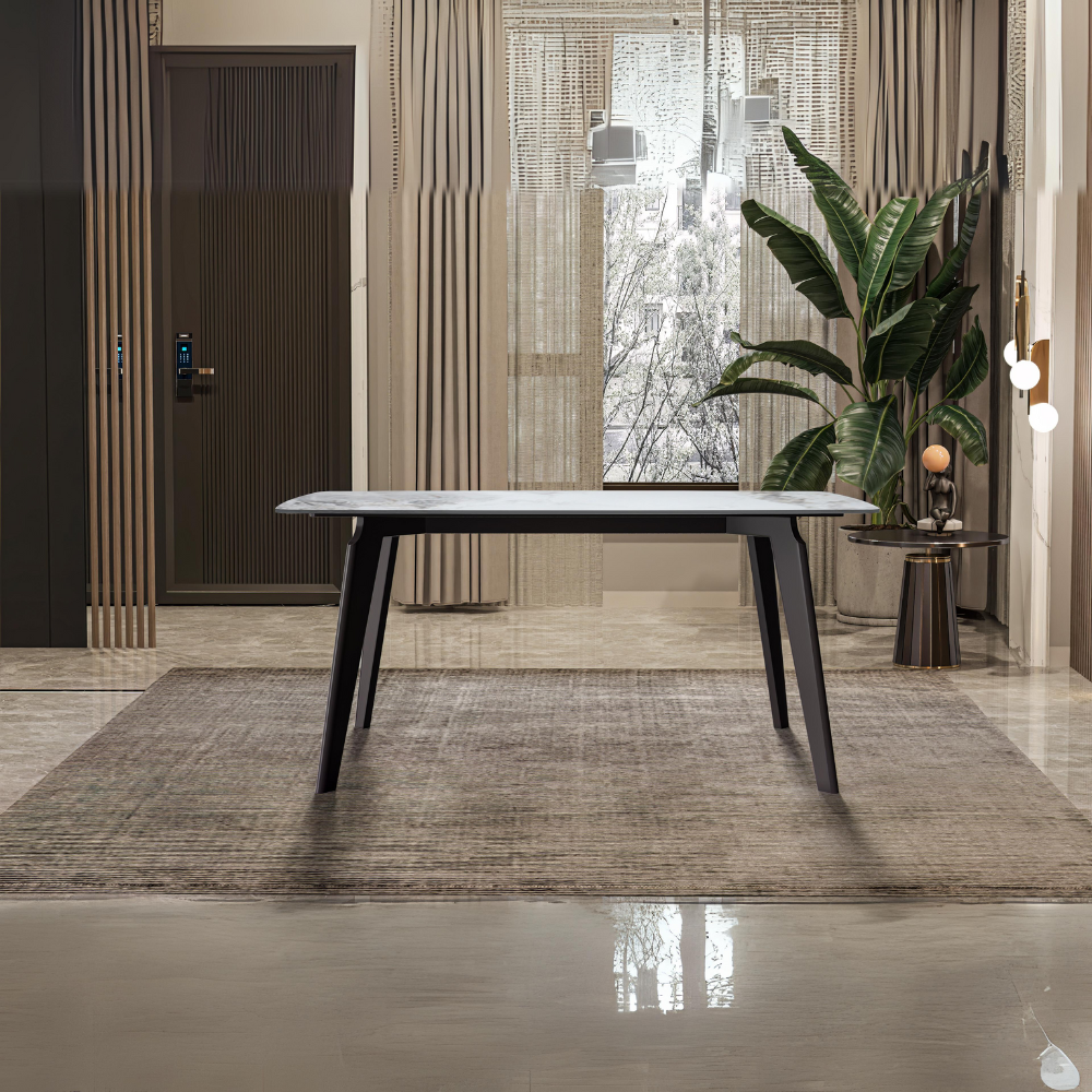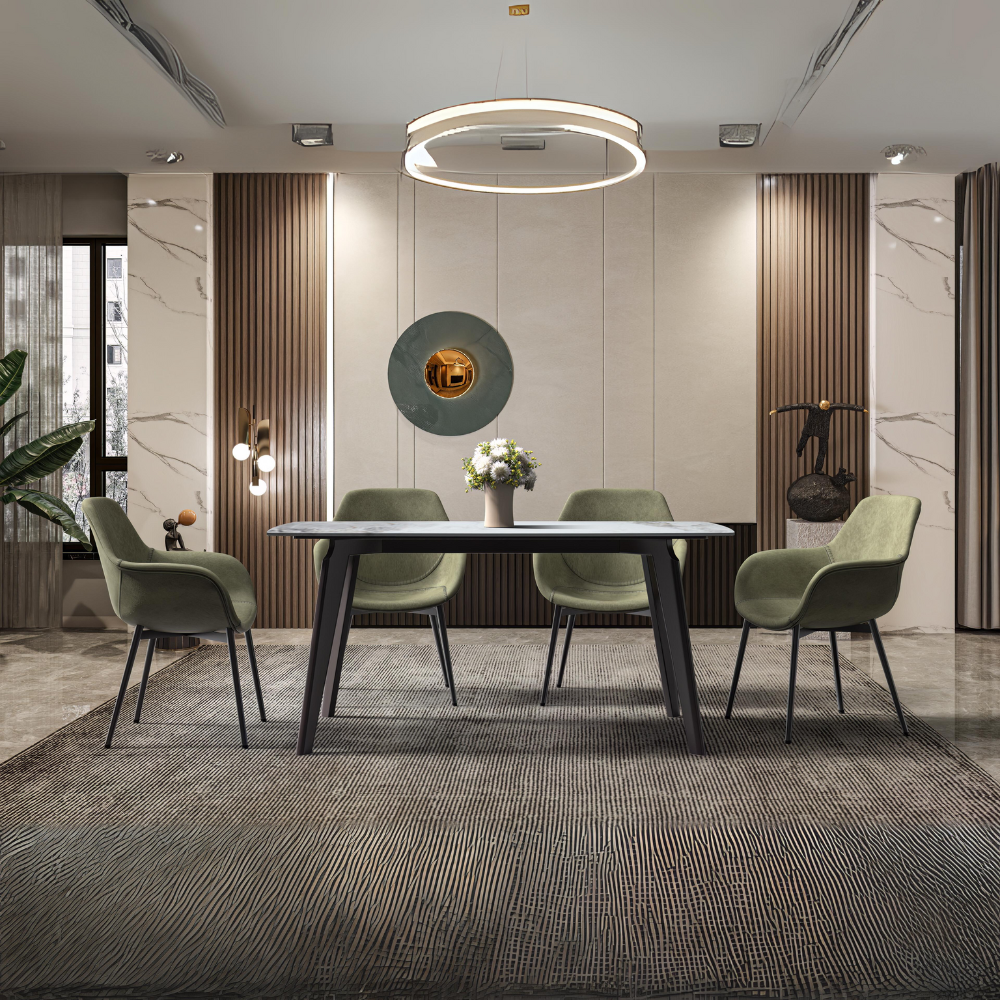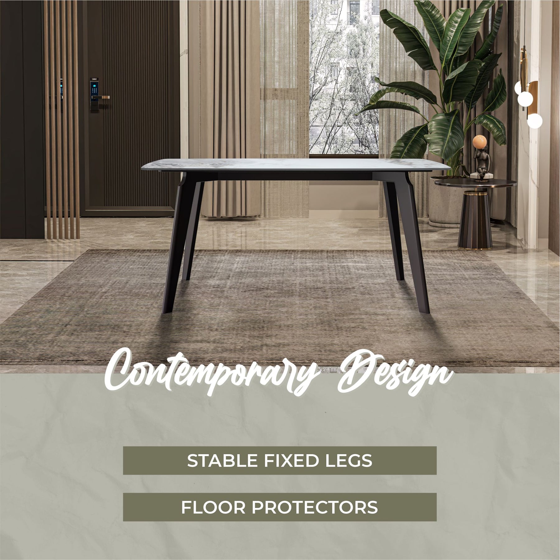 - Crafted from premium sintered stone or glass tabletops, our modern dining table boasts advanced materials renowned for their durability and minimal upkeep requirements. The sintered stone surface provides heat and scratch resistance while the glass provides sophistication with its sleek and reflective surface.
