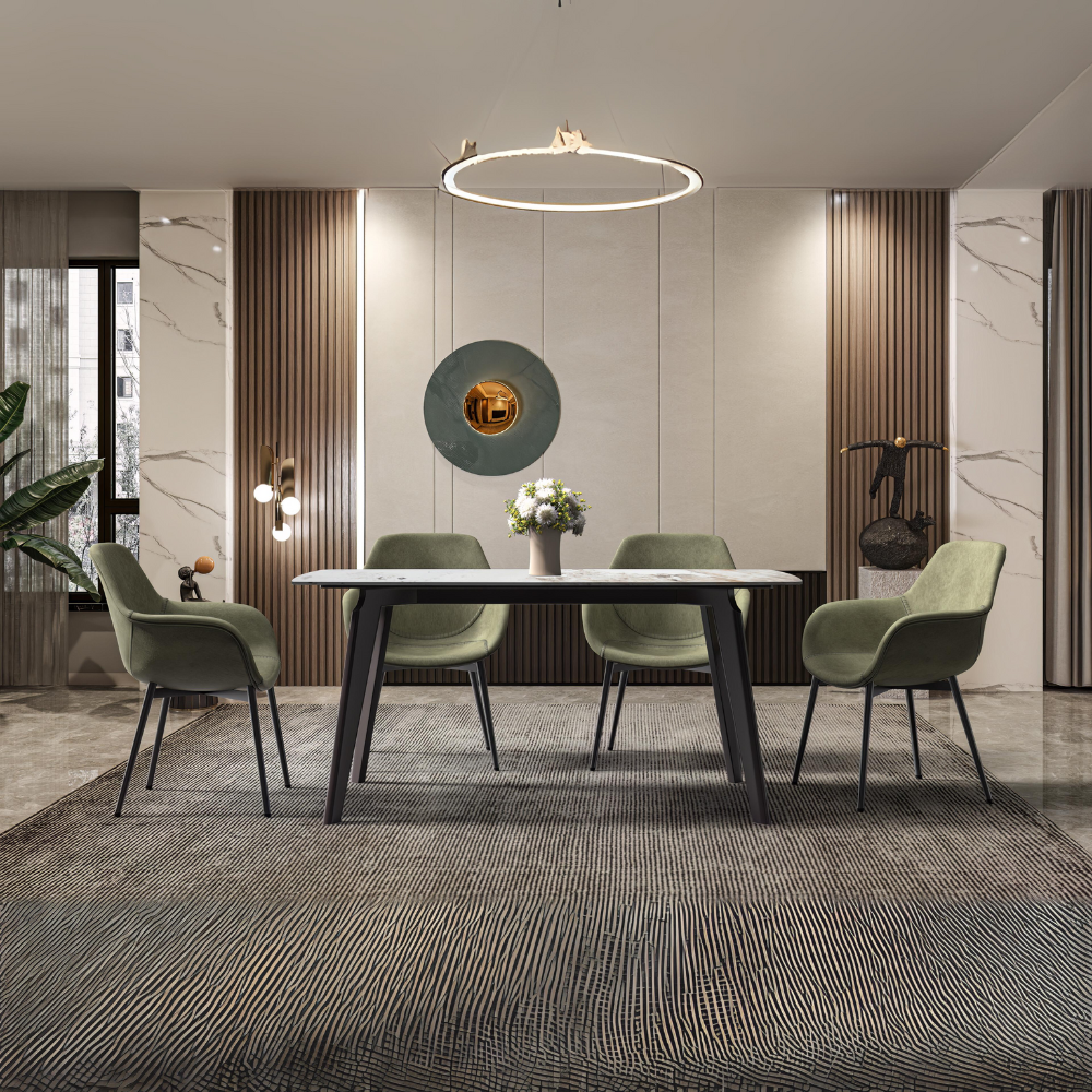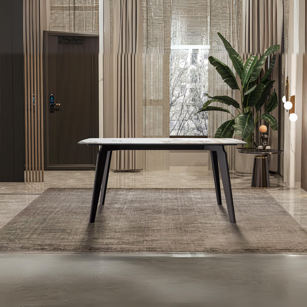 - Crafted from premium sintered stone or glass tabletops, our modern dining table boasts advanced materials renowned for their durability and minimal upkeep requirements. The sintered stone surface provides heat and scratch resistance while the glass provides sophistication with its sleek and reflective surface.
