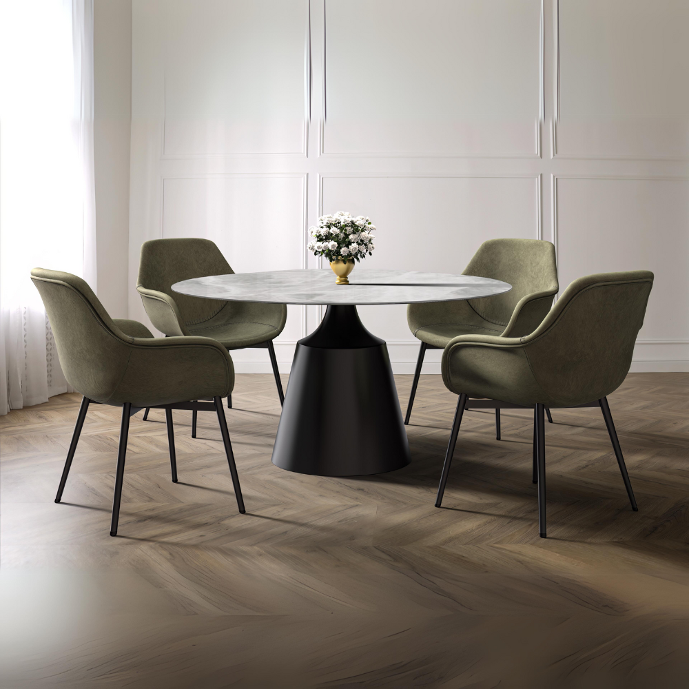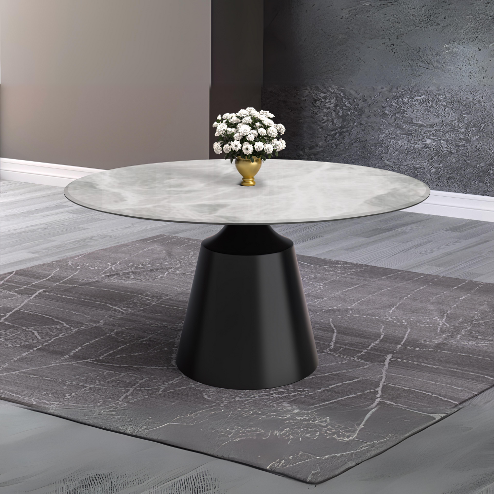 - Discover our contemporary dining table, meticulously crafted to elevate your kitchen or dining area with sleek style. Its clean lines and rounded shape tabletop seamlessly complement modern home decor, while the robust stainless steel pedestal base ensures stability and longevity. Choose between a glass or sintered stone tabletop to suit your preferences. Elevate your dining experience effortlessly with this versatile addition to your home.