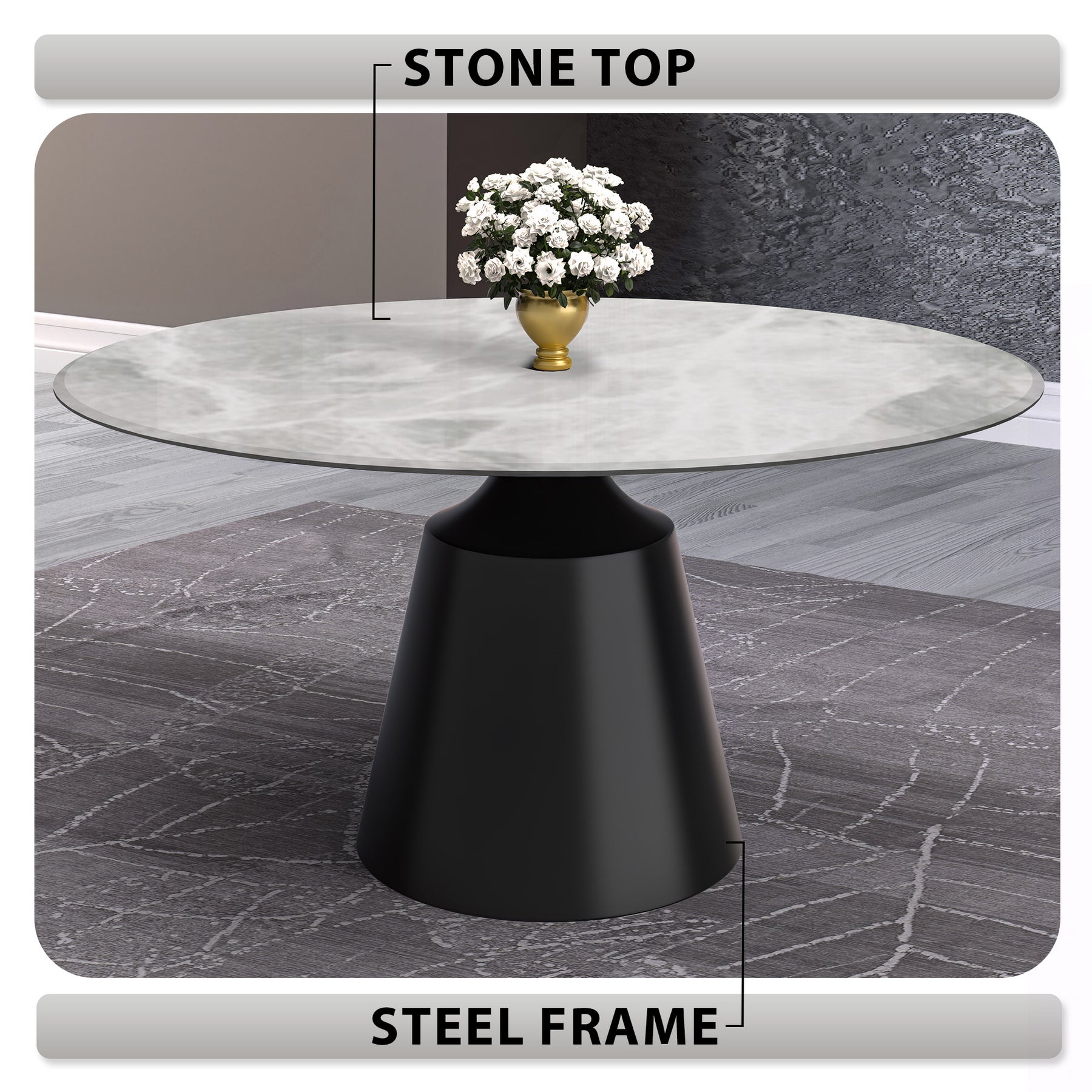- Meticulously crafted, the dining table boasts a stainless-steel pedestal base, ensuring exceptional durability and timeless aesthetic appeal. Its sturdy construction guarantees longevity, making it perfect for hosting countless meals and gatherings without sacrificing style or performance.
