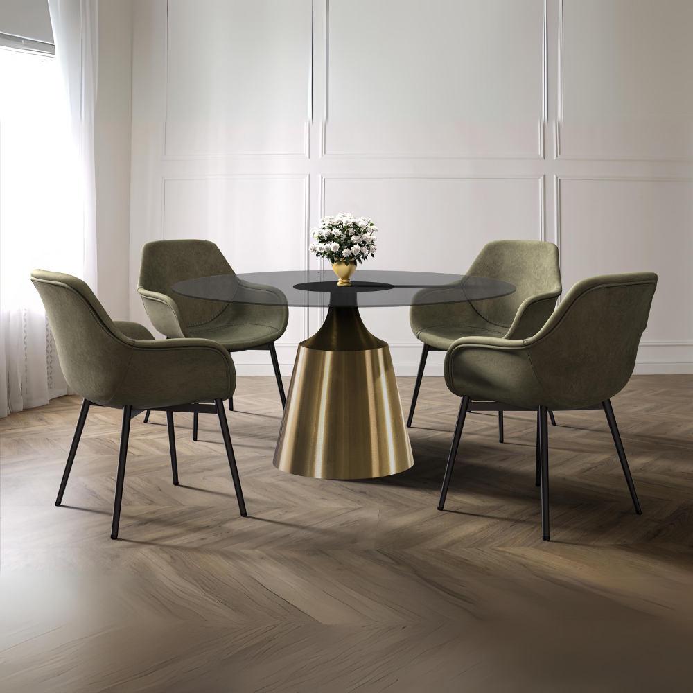 - Choose between a sintered stone or glass top, both of which offer a combination of durability and elegance. The sintered stone surface offers both heat and scratch resistance, while the glass top enhances sophistication by beautifully reflecting light, creating a visually striking dining space.