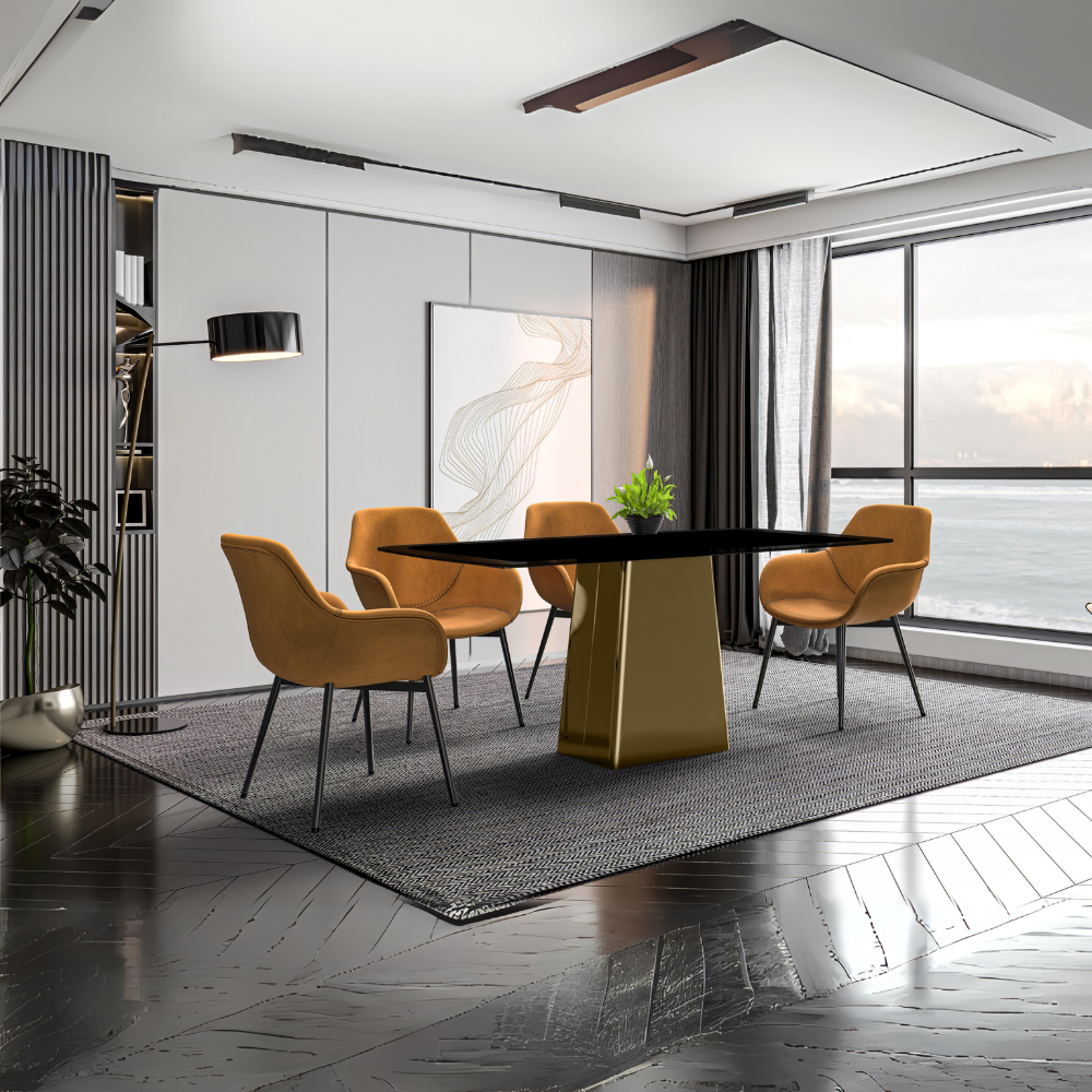- Choose between a sintered stone or glass top, both of which offer a combination of durability and elegance. The sintered stone surface offers both heat and scratch resistance, while the glass top enhances sophistication by beautifully reflecting light, creating a visually striking dining space.