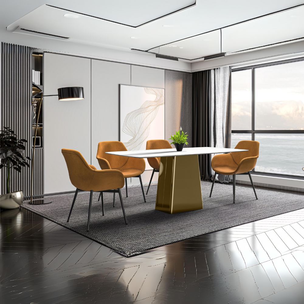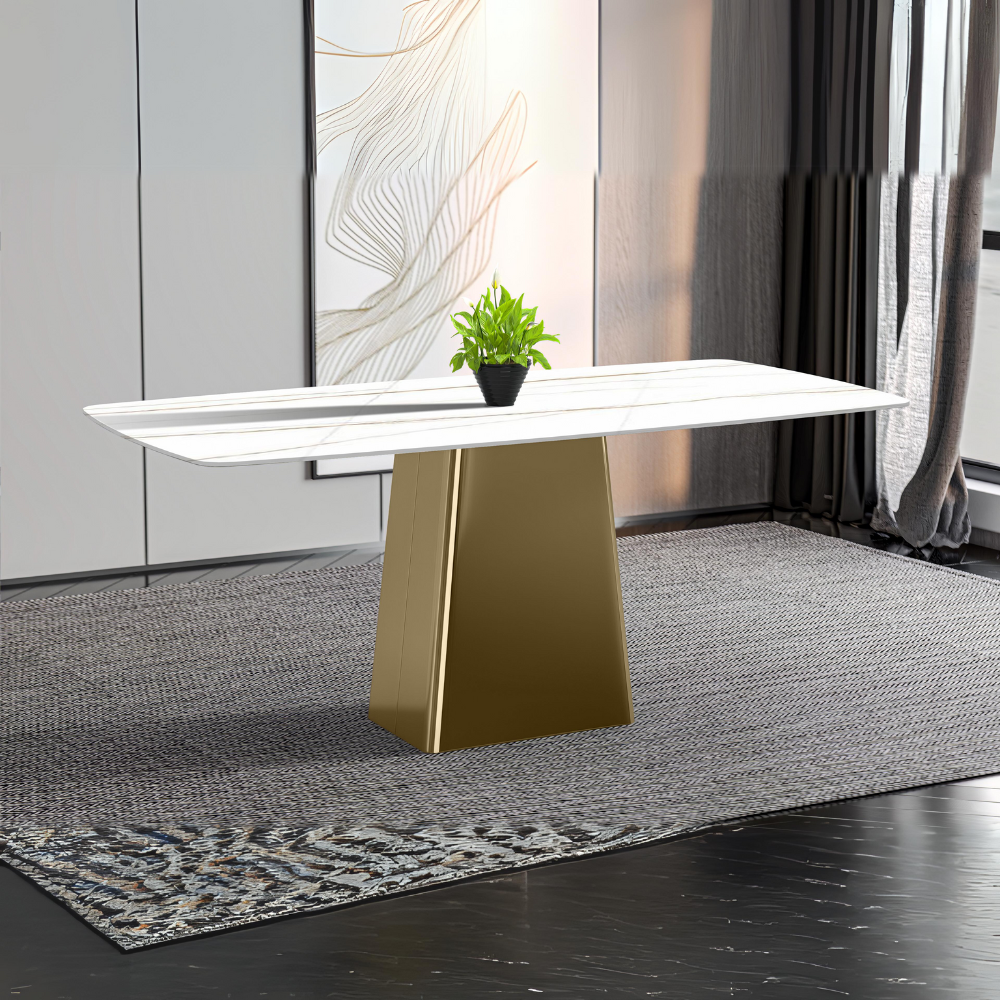 Quinix Series Dining Table, Gold Base With 55" White/Gold Sintered Stone Top