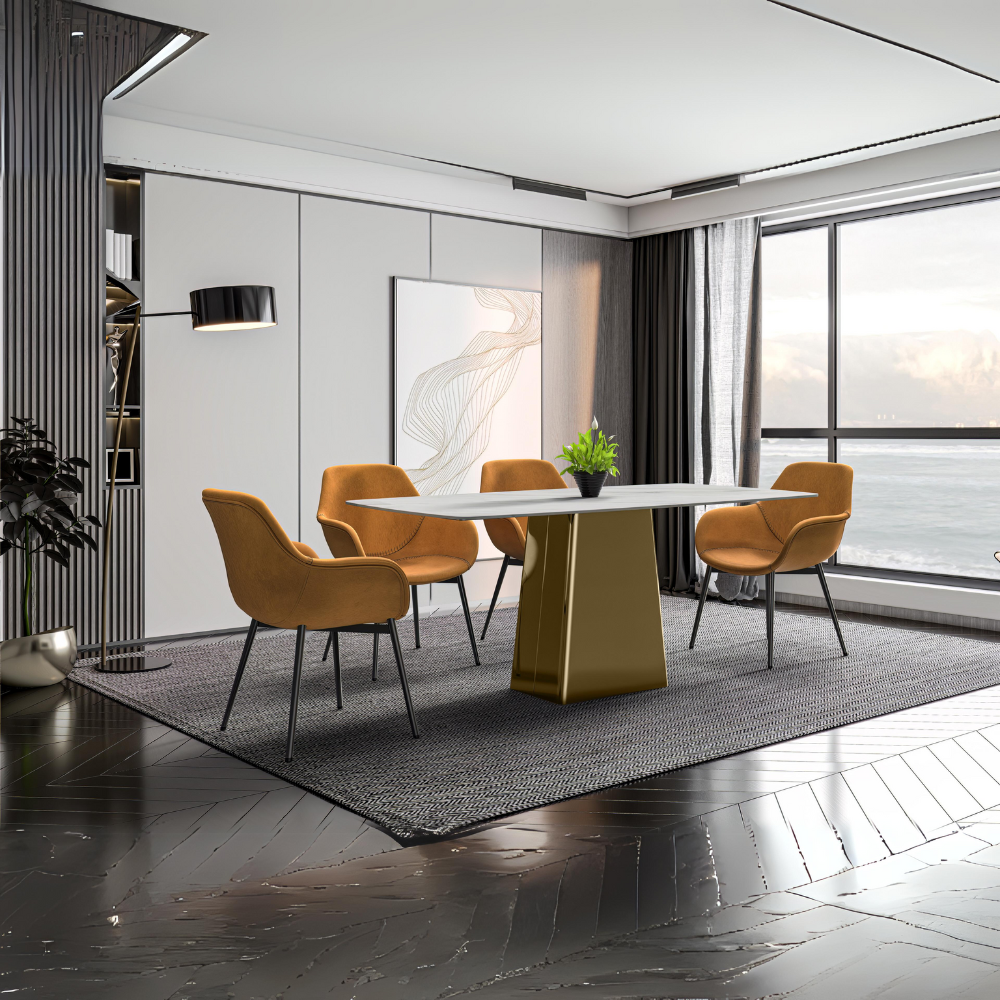 - Choose between a sintered stone or glass top, both of which offer a combination of durability and elegance. The sintered stone surface offers both heat and scratch resistance, while the glass top enhances sophistication by beautifully reflecting light, creating a visually striking dining space.