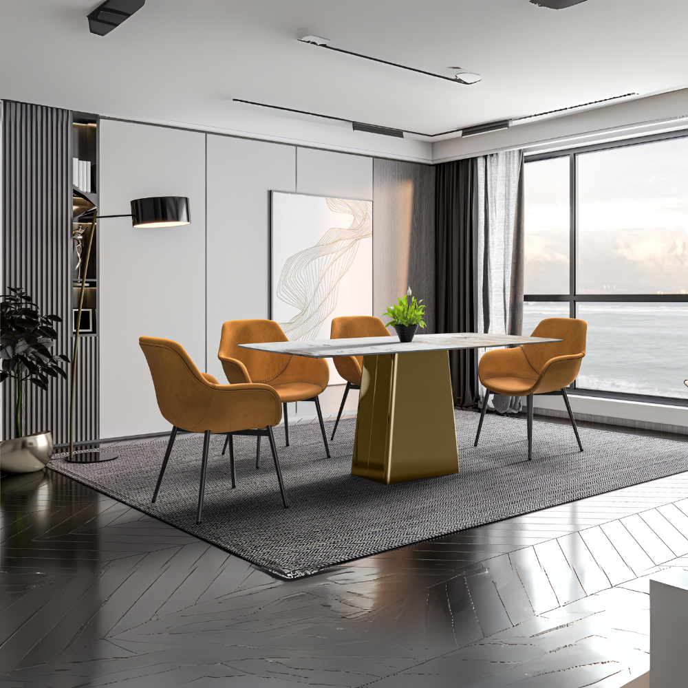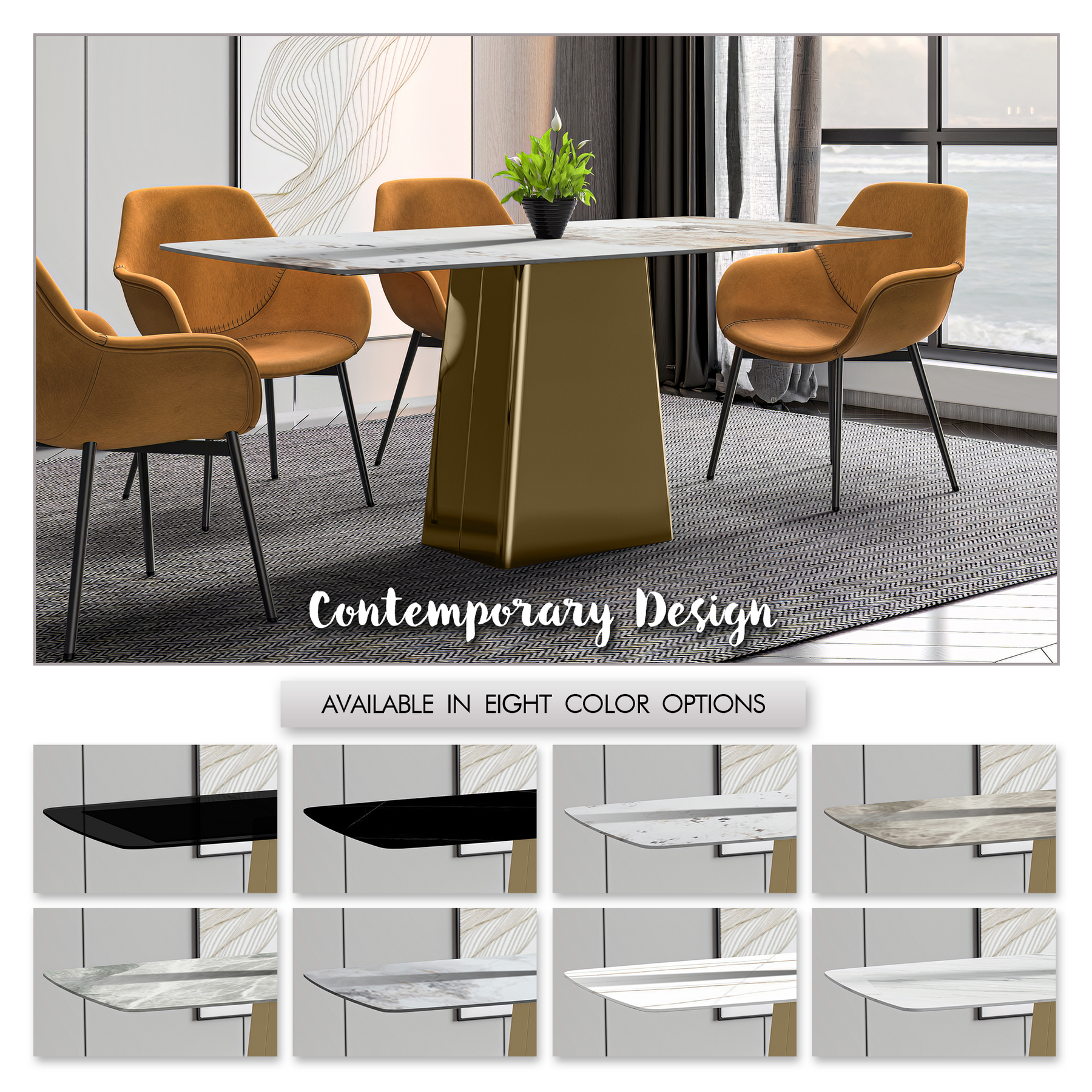 - Choose between a sintered stone or glass top, both of which offer a combination of durability and elegance. The sintered stone surface offers both heat and scratch resistance, while the glass top enhances sophistication by beautifully reflecting light, creating a visually striking dining space.