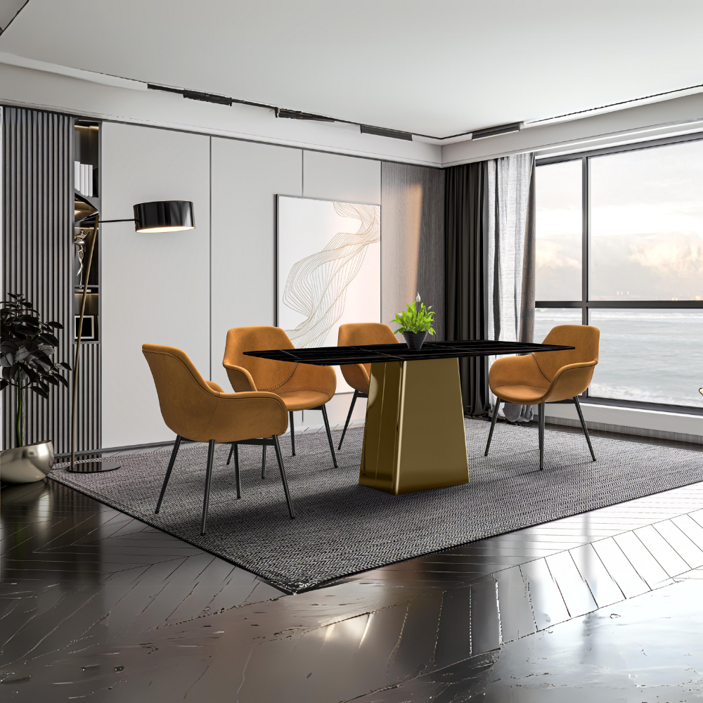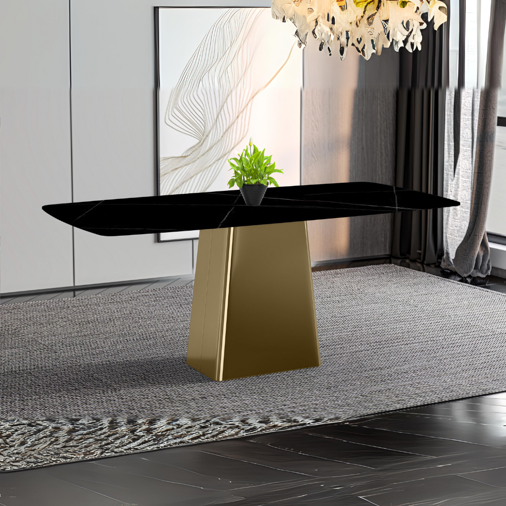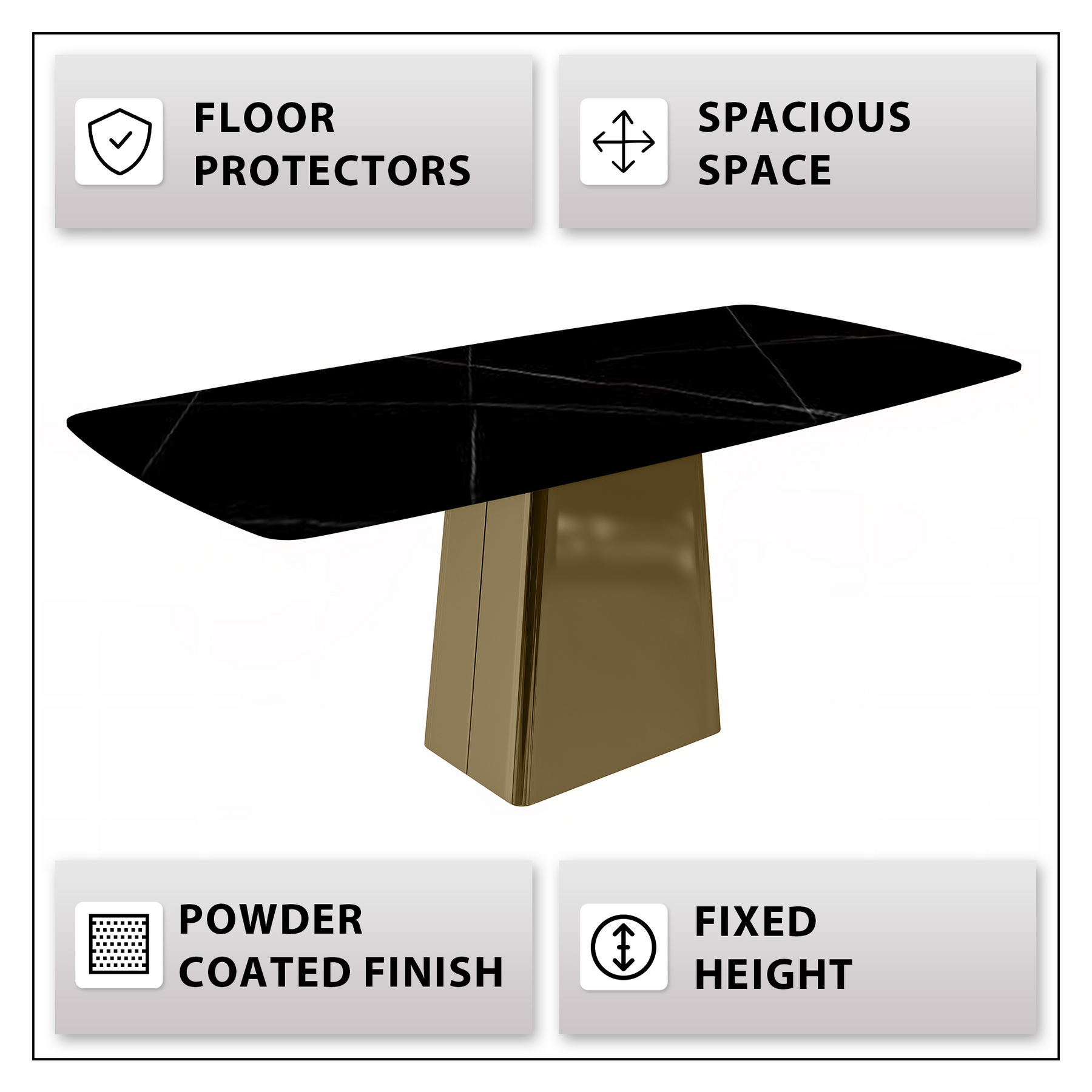 Quinix Series Dining Table, Gold Base With 71" Black/Gold Sintered Stone Top